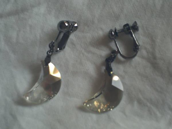 新品・ハンドメイドです。 オーストリアのスワロフスキー社のクリスタルガラスを使って作りました。 金具の色は黒色・メッキです。ネジバネ式です。 ガラスのカラー 透明の黒色 月のサイズ 20mm |
