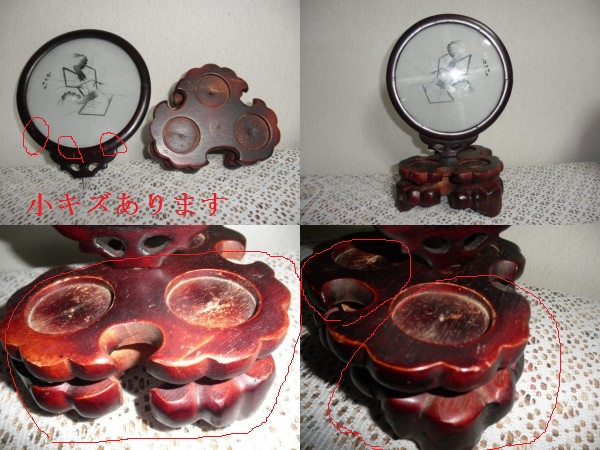 | 中国の古いスリガラス及び花台です。 スリガラスの中に絵が描かれています。(エビの絵?) 画像で表示のようにスリガラスの外枠ぶ及び花台の全体に 経年のキズ、汚れ、スレ、裏部欠損等ございます。 スリガラスの全体外枠は外れるようになっています。取り付け部分は、少しぐらつき感がございます。ご理解ください またスリガラス部と花台は外れるようになっています。 材質も別々のものです。ご理解ください。 画像でご判断されて古いものをご理解納得されてのご入札をお待ちしております。 材質は、判りません サイズ 花台部 上径15.2cm ×12.5cm高さ5.8cm スリガラス17.3cm 花台から上部まで高さ25.5cm ※細かい点を気になさるお方もしくは新品をお求めのお方は、ご入札をお控えください。 ご理解納得されてのご入札をお願いいたします。 お願い事項 ♪お客様のPC環境で、実物の商品の色と多少の誤差が生じる場合がございます。それらの点を十分ご理解いただいた上でご入札頂きますようお願い申し上げます。 ♪お客様の思い描くイメージが違うと言った返品はご勘弁ください。 ♪システム手数料・消費税、梱包代金等、一切頂戴致しておりませんので、ご安心して御落札下さい。 ♪発送は基本的に、ゆうパックでの発送になります。 | |||