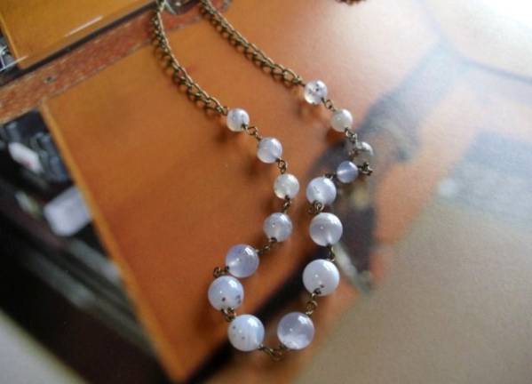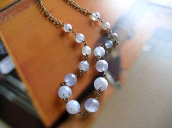 パンク・ガール・・シリーズです♪可憐な水色・・繊細なブルーカルセドニーのネックレスです♪丸玉のカルセドニーがロマンチックな表情です♪6ミリ、8ミリの丸玉のブルーカルセドニーはランダムに紡いでいます♪長さは全長77センチ 位で調節自由です♪チョーカー風にされたり、ブレスレットにされても素敵です♪お揃いのネックレスやブレスレットも出品しています♪シンプルで飽きのこないいつまでも着けられるデザ インを考えて作りました♪ハンドメイドをご理解頂いてノークレーム、ノーリターンでお願いします