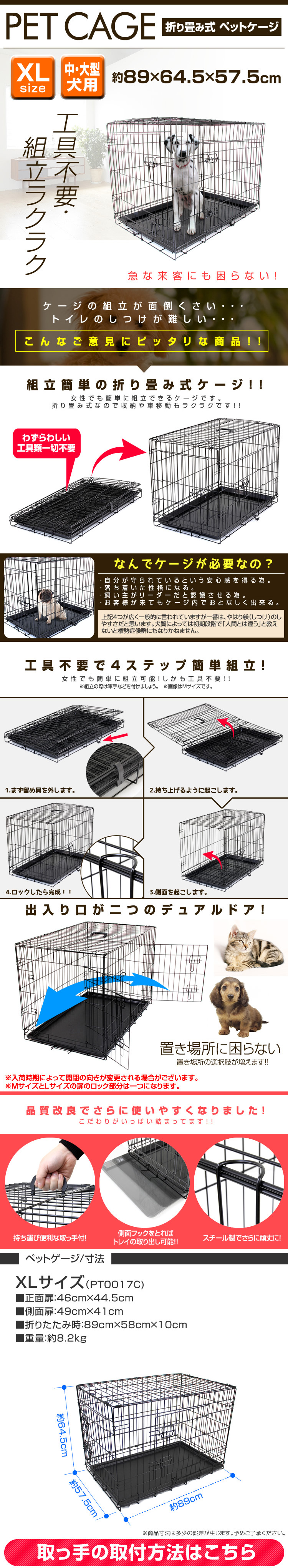 お留守番や、しつけに最適! 移動に便利な折りたたみ式ペットケージ。 本体はネジ等を一切使用せず、パタパタっと開くだけの簡単組み立て式です。 折りたたむことができるので、使わない時の収納や移動する時もラクラク! 日頃からケージを自宅で使用し、ワンちゃんも使い慣れることで、お出かけ先でも安心して休むことができ、ストレスの軽減にもつながります。 留守中やワンちゃんから目を離す時、いたずらによる怪我や事故の防止にも役立ちますし、緊急時の避難用にも重宝します。 【商品仕様】 カラー:ブラック サイズ(約):89cm×57.5cm×64.5cm (折りたたみ時(約):89cm×58cm×10cm) 材質:スチール、ABS樹脂 重量(約):8.2kg 参考サイズ:ダルメシアン ラブラドール 等 【注意事項】 ・こちらの商品は中・大型犬用のケージとなります。 ・ご注文時サイズは必ずご確認ください。 ・参考サイズはあくまで目安です。 ・本製品は屋内専用です。屋外で使用すると錆や変色の原因となります。 ・サイズ間違い、イメージとの違いによる返品、交換は一切行っておりません。 ・海外製品で、簡易梱包での輸入のため風防に擦れや多少の小キズなどがある場合がございますが、商品自体には問題ありませんのでご了承下さい。 ・仕様・デザインは改良のため予告なく変更することがあります。 |