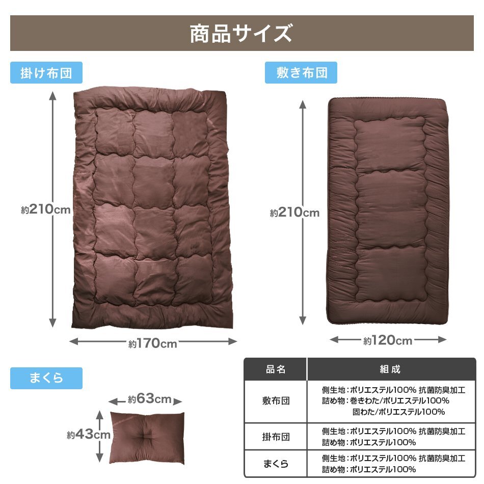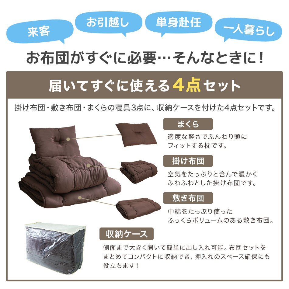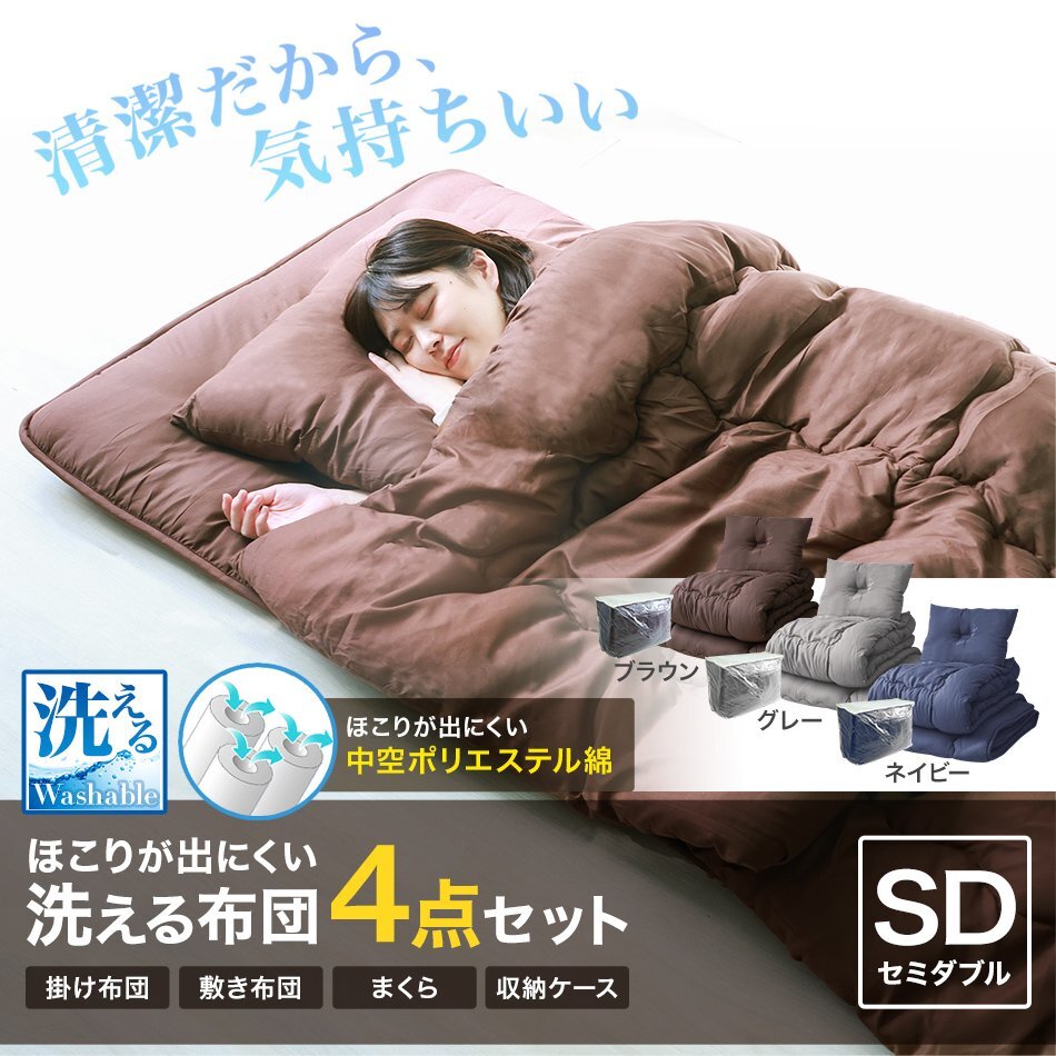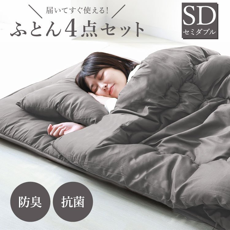 届いてすぐ使える寝具3点+収納ケースの4点セットです。 中綿には抗菌・防臭効果のある衛生的な中空ポリエステル綿を使用! 耐摩擦・耐久性に優れ、ホコリが出にくく睡眠の妨げとなるムズムズ感を軽減します。 アレルギーのある方や敏感肌の方におすすめです♪ 底付き感を感じないボリュームで、快適な寝心地とふんわり優しく包みこまれる気持ちよさを実現! また、抗菌防臭加工が施されており、いつでも清潔に使えます。 \すぐ使えるから、こんな方におススメ♪/ ・一人暮らしや新生活を始める方 ・新生活を始める方 ・来客者用の布団一式を考える方 ・布団、寝具の買い替えを考える方 ・社員寮など業務用として考える方 【商品内容】 掛け布団、敷き布団、まくら、収納ケース 【商品詳細】 カラー:グレー サイズ:セミダブル :掛け布団 (約)170cm x 210cm :敷き布団 (約)120cm x 210cm :まくら (約)63cm x 43cm 素材:ポリエステル (寝具セット ふとんセット カバーセット ふとんカバー 布団 おしゃれ 人気 おすすめ WEIMALL) |
