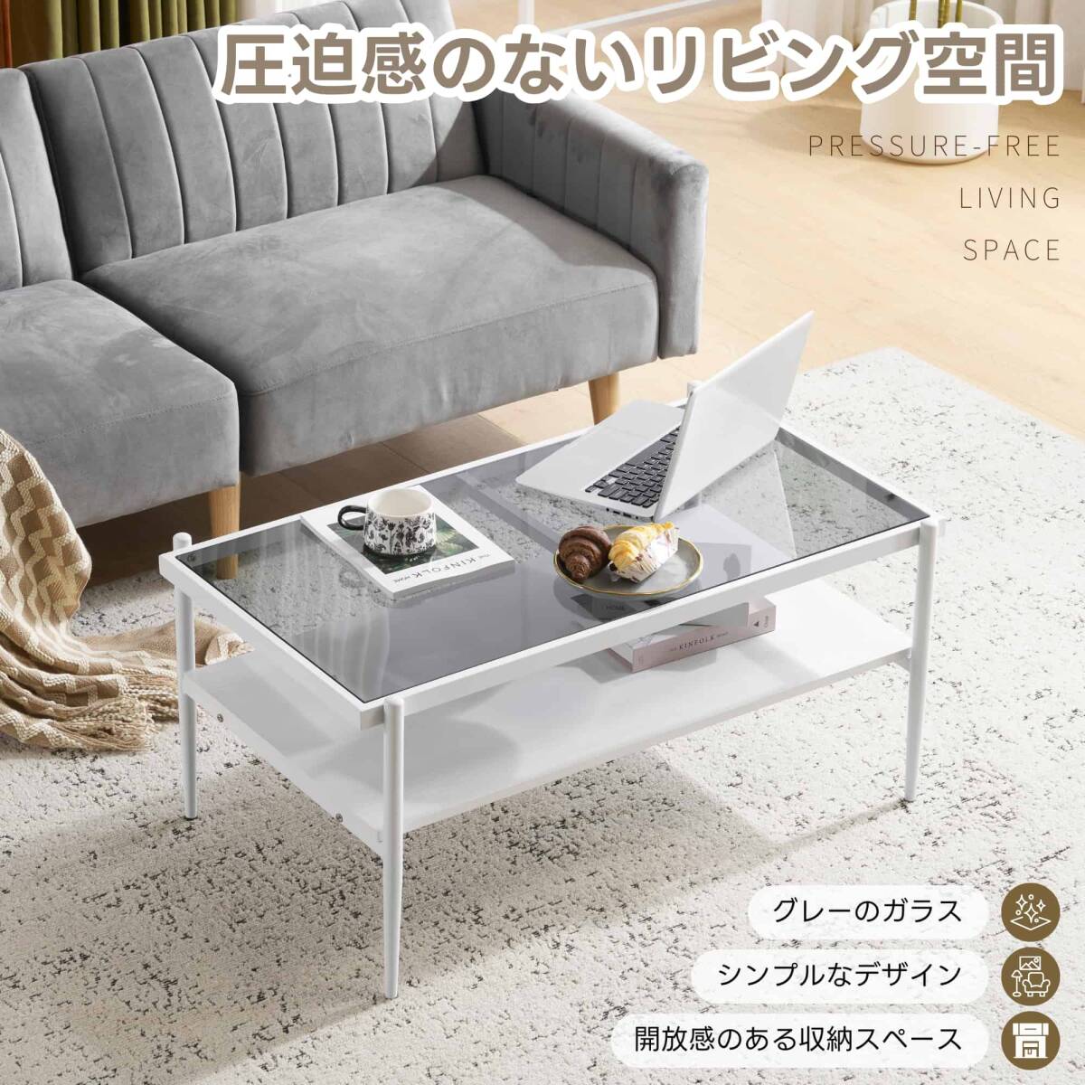 収納付きセンターテーブル ローテーブル センターテーブル ガラステーブル 二段収納 強化ガラス おしゃれ リビング 一人暮らし 幅90㎝
