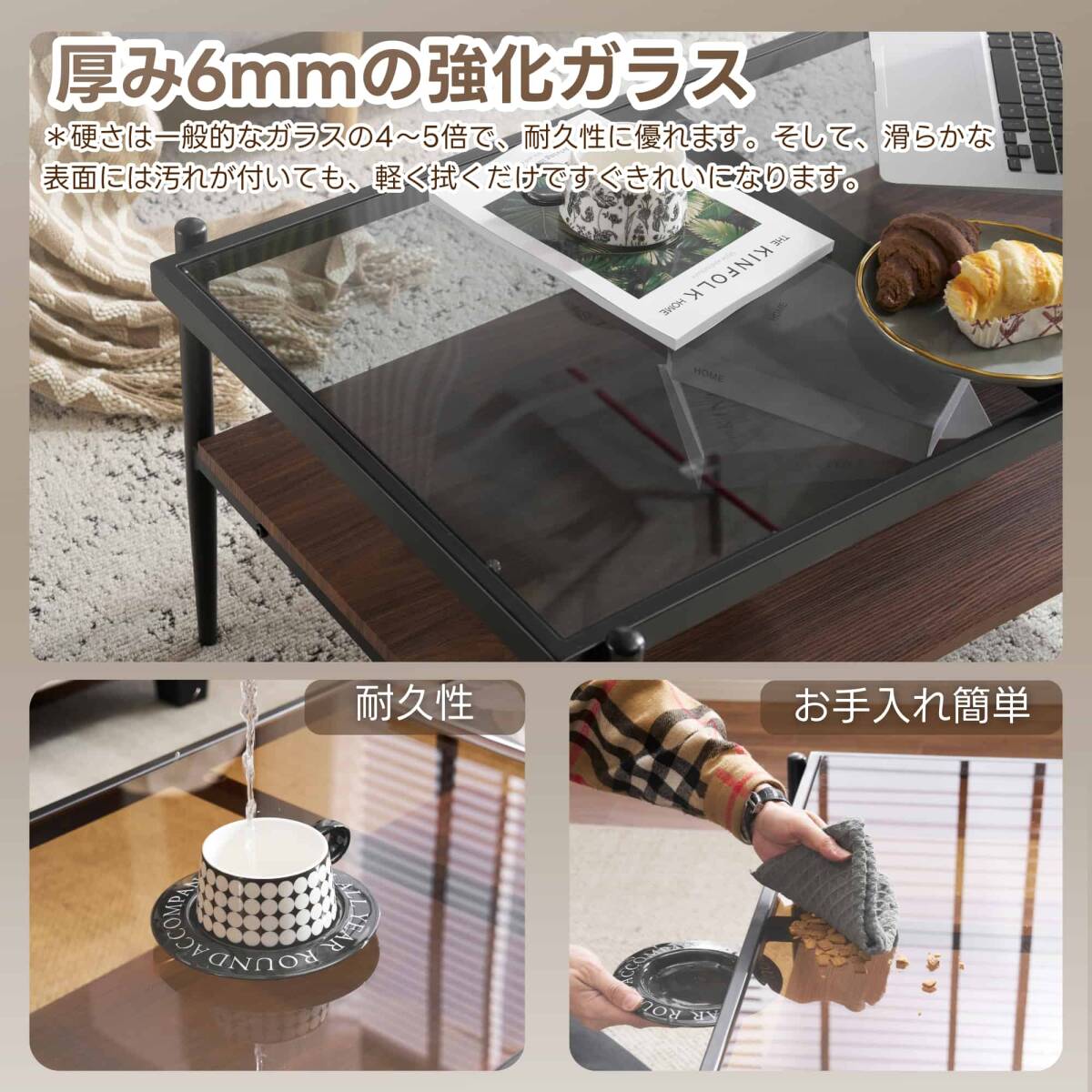 • 【魅力的な質感】天板と本体のカラーが反転した3パターンのカラーをご用意しました。木目デザイン、視界が遮られないガラスとスチールを組み合わせたデザインが特徴です。美しい木目の質感は、重厚感と温かみのあるウッド調を演出し、ガラス天板は北欧風の明るい雰囲気を提供します。また、直線的なシンプルデザインが、どんなインテリアにも調和します。このローテーブルは、視覚的にも魅力的で、圧迫感のない開放的なリビング空間が実現します。
