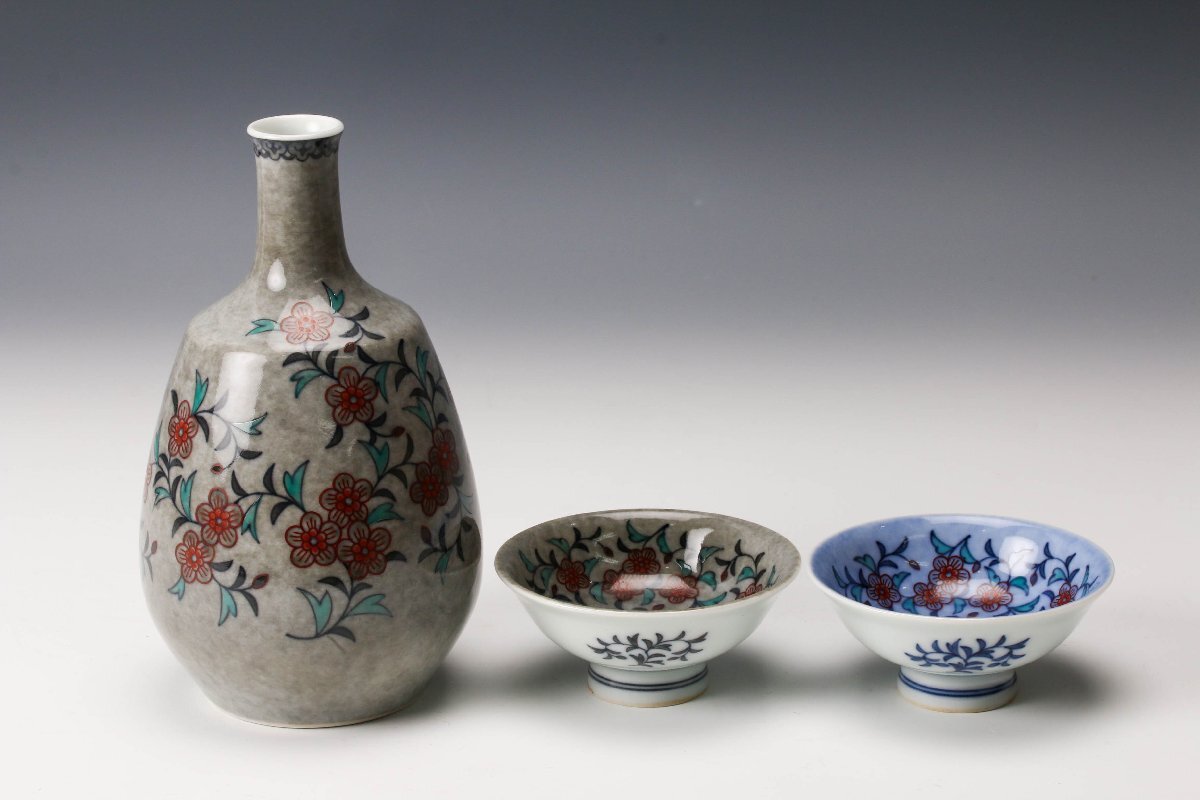 【佳香】人間国宝 十三代 今泉今右衛門 本人作 色絵吹墨薄墨草花文酒器揃 徳利 盃 二客 共箱 共布 栞 本物保証