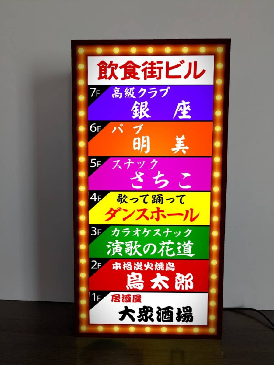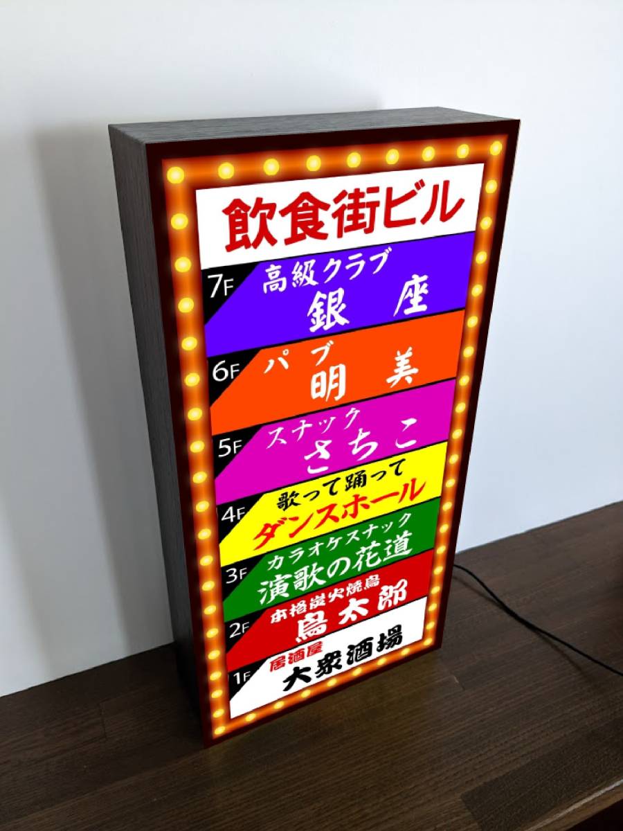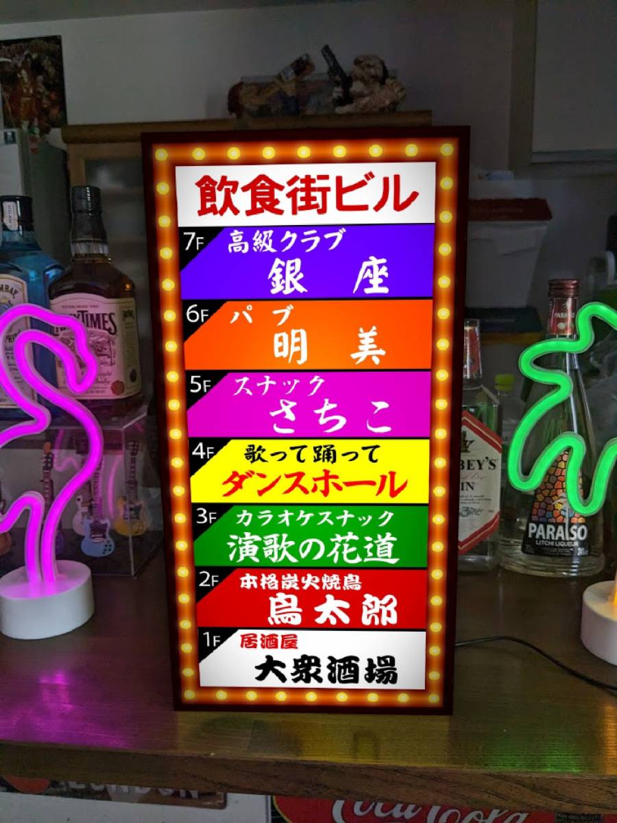 ◆他には無いおもしろグッズ◆おもしろ看板◆ 昭和の匂いが漂う懐かしい大人の夜の街、電球も印刷で思わず笑っちゃうデザインのオモシロ電飾看板です★ ◆全ての文字変更オーダー無料で承ります!! 自分の名前で!友達・母親・ペットなんでもOK! 自宅に飾ってスナック気分!行きつけのお店のママにプレゼントにも喜ばれています! ご購入頂いた後に、取引画面で名前の変更などお気軽にコメント下さい! 自宅でこの看板のライトを点灯させて 少しでも雰囲気出してたまに宅飲みも良いですよ★ 楽しく、明るくお家時間を楽しめます。 ◆Lサイズ◆20センチ×40センチ×奥行き7センチ ◆材質◆本体(アクリルプラスチック製)・表示面(IJバックライト発光フィルム貼り) ◆電源◆USB供給電源 〇他サイズ〇 ●SSサイズ 75mm×150mm (3D造形BOX黒本体) ●Sサイズ 10センチ×20センチ ●Mサイズ 150mm×300mm ●LLサイズ 300mm×600mm ●3Lサイズ 400mm×800mm ●4Lサイズ 500mm×1000mm ◆オリジナルデザイン・オーダーも承っておりますので、 お気軽にお問い合わせください。 自社製造製品 店舗 自宅 キッチンカー フードトラック 屋台 パーティー イベント サイン ランプ ライト 照明 看板 インテリア雑貨 置物 雑貨 テーブル カウンター 電飾看板 電光看板