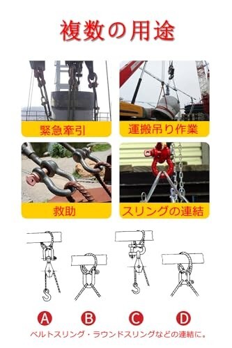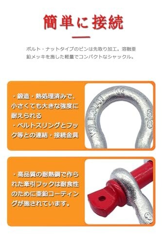 【用途】ベルトスリング・ラウンドスリングなどの連結にの接続金具。錆びない超合金シャックル。重量物吊上・車輛等の牽引・貨物台付・機械巻上 等