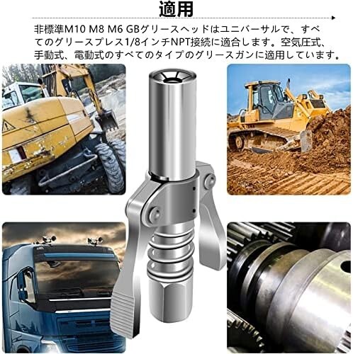 【適用】非標準M10 M8 M6 GBグリースヘッドはユニバーサルで、すべてのグリースプレス1/8インチNPT接続に適合します。空気圧式、手動式、電動式のすべてのタイプのグリースガンに適用しています。