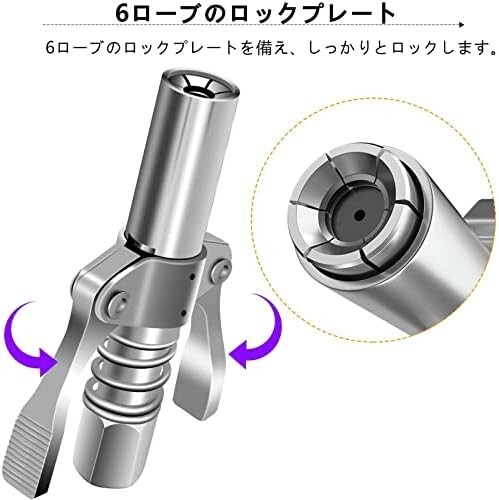 【ロックデザイン】ノズルのシールリングは円錐形のゴムでできており、6ローブのロックプレートを備え、しっかりとロックします。ハンドルを押すとロックヘッドが伸びて、ハンドルを離すとオイルニップルがロックされます。