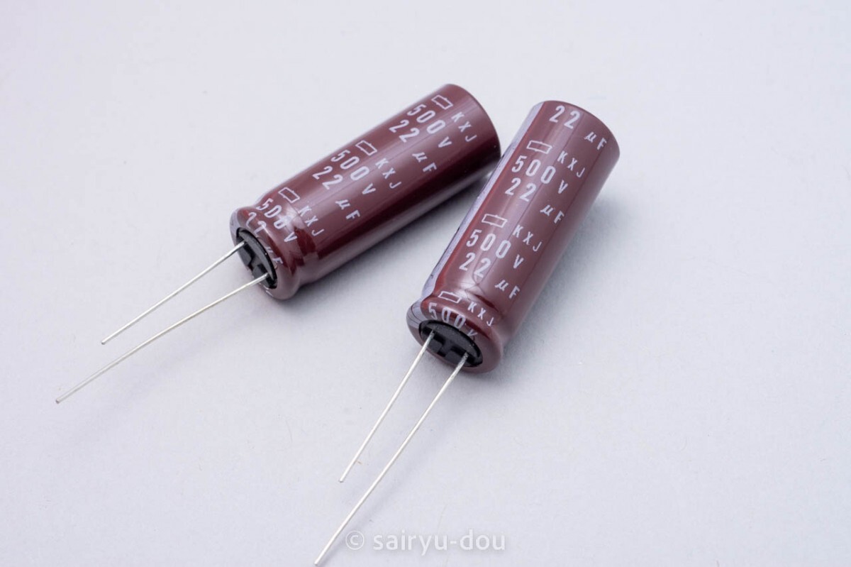 日本ケミコンのKXJシリーズ長寿命型アルミ電解コンデンサです