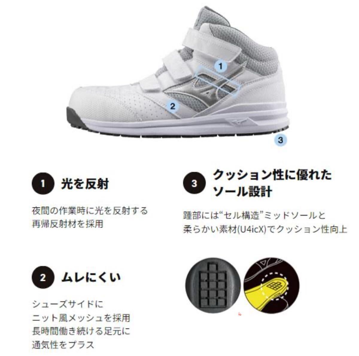 機能:JSAA、樹脂先芯、耐滑性、通気性、軽量屈、曲性、反射材、耐油性、Small、Big