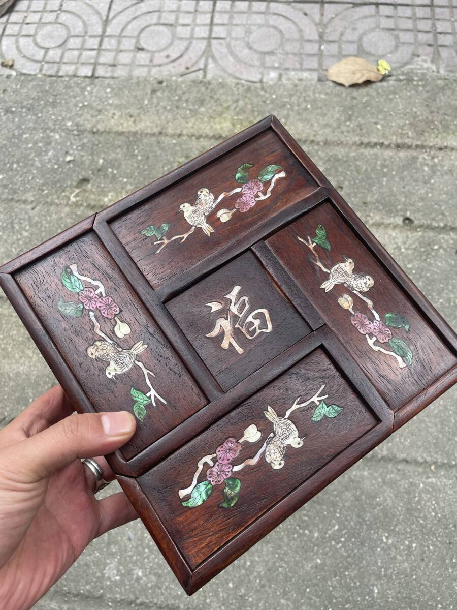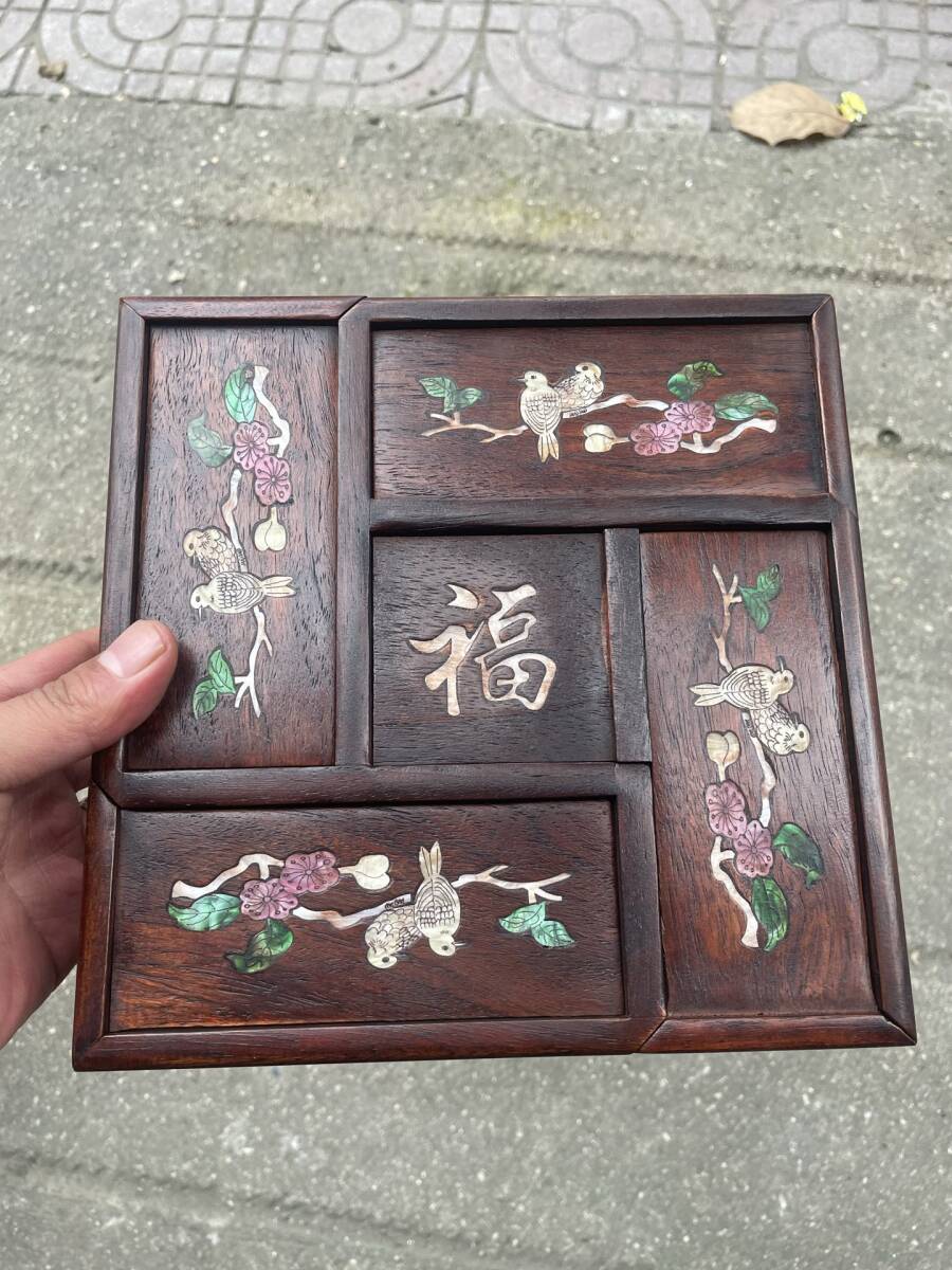 【超珍館蔵】花梨木製 細密彫 貝殼嵌 鳥踏花枝紋 五開盒 置物 賞物 古賞物 古美術品 稀少珍蔵品