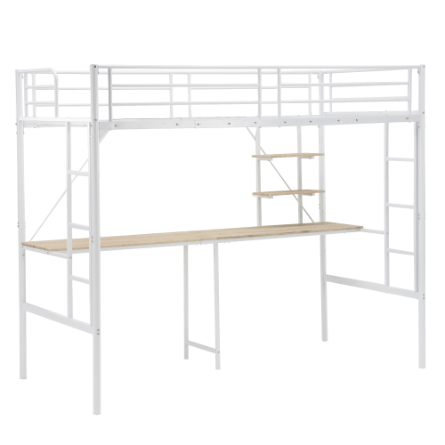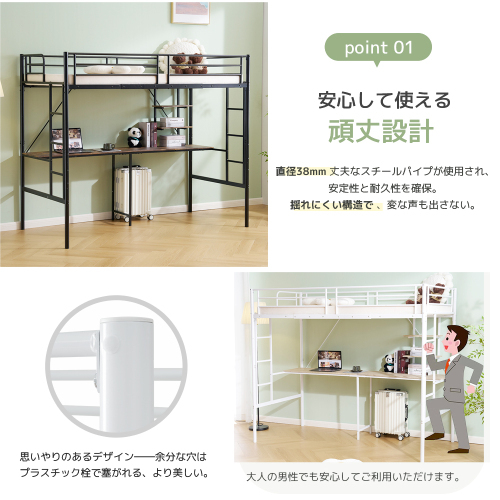 システムベット ロフトベッド シングル デスク付き ラック棚付き ハシゴ階段 耐荷重150kg 高さ170cm 北欧風 二段ベッド 大人ベッドホワイト