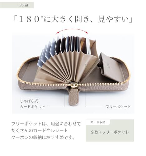 【カードも小銭もたっぷり収納】コンパクトなボディに、使いやすさのための工夫を詰め込みました。じゃばら式カードポケットでたっぷり大容量。ラウンドファスナーを開けば180度広がるので、使いたいカードが一目瞭然。小銭入れは便利なボックス型です。