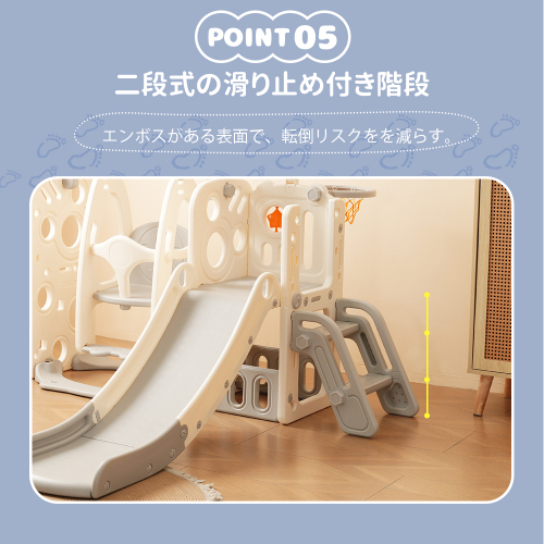 • 【滑り台】加速 → 減速 → 緩衝の3段階構造ですべりすぎを防ぎ、安全に着地。広めの待機スペースで、向きを変えてもゆったり快適