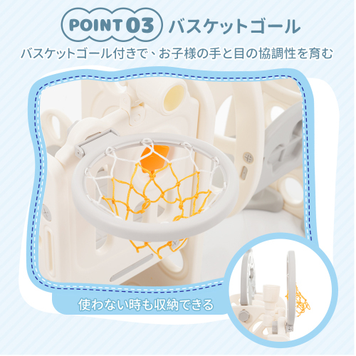 • 【1台で4役をこなす!オールインワン遊具】1ブランコ、2バスケットゴール、3滑り台、4収納スペース。//おうちがいちばんの遊び場に悪天候でも安心:雨・雪・猛暑でもおうちで元気に遊べる!時間を気にせず遊べる:営業時間も順番待ちもなし!好きなだけ遊べる外出不要でラクラク:外出せずにすぐ遊べて、ママパパもラクちん!外のリスクを避けられる:ウイルスや花粉の心配なし、安全な室内空間で見守れる//