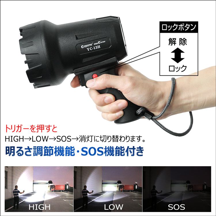 | ★オススメポイント★ ●15°狭角配光:900m超遠距離照射を実現 ●トリガースイッチで点灯3モードを切り替え ●ロック機能付き:誤点灯・誤消灯を防止 ●IP65防水加工:屋外でも利用可能 ●持ちやすく操作がしやすいガンタイプ ●充電式・コードレス:電源のないところでも安心に使える |