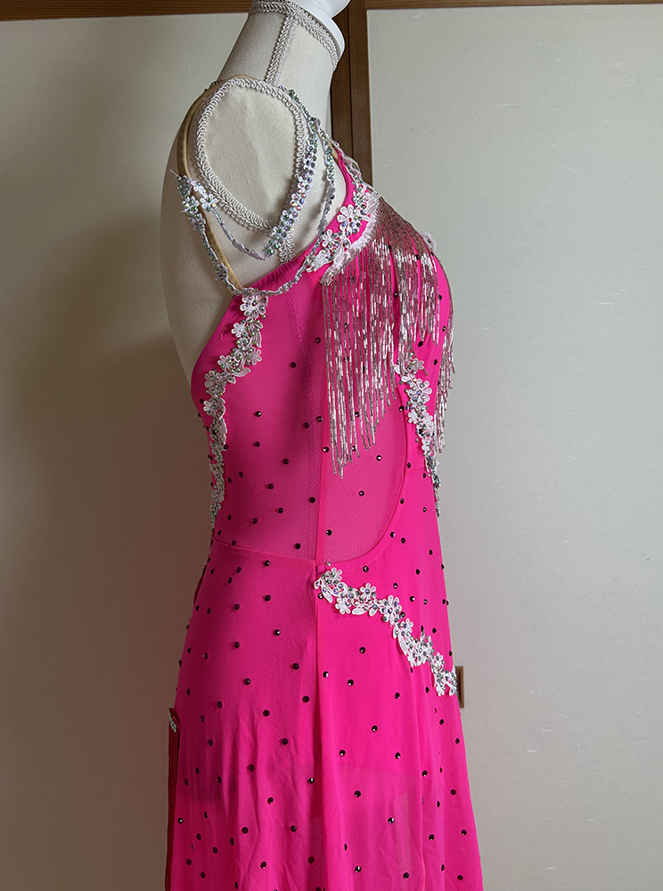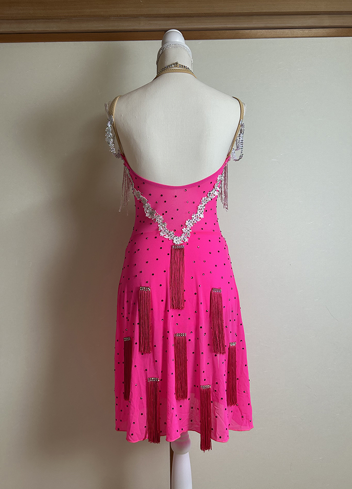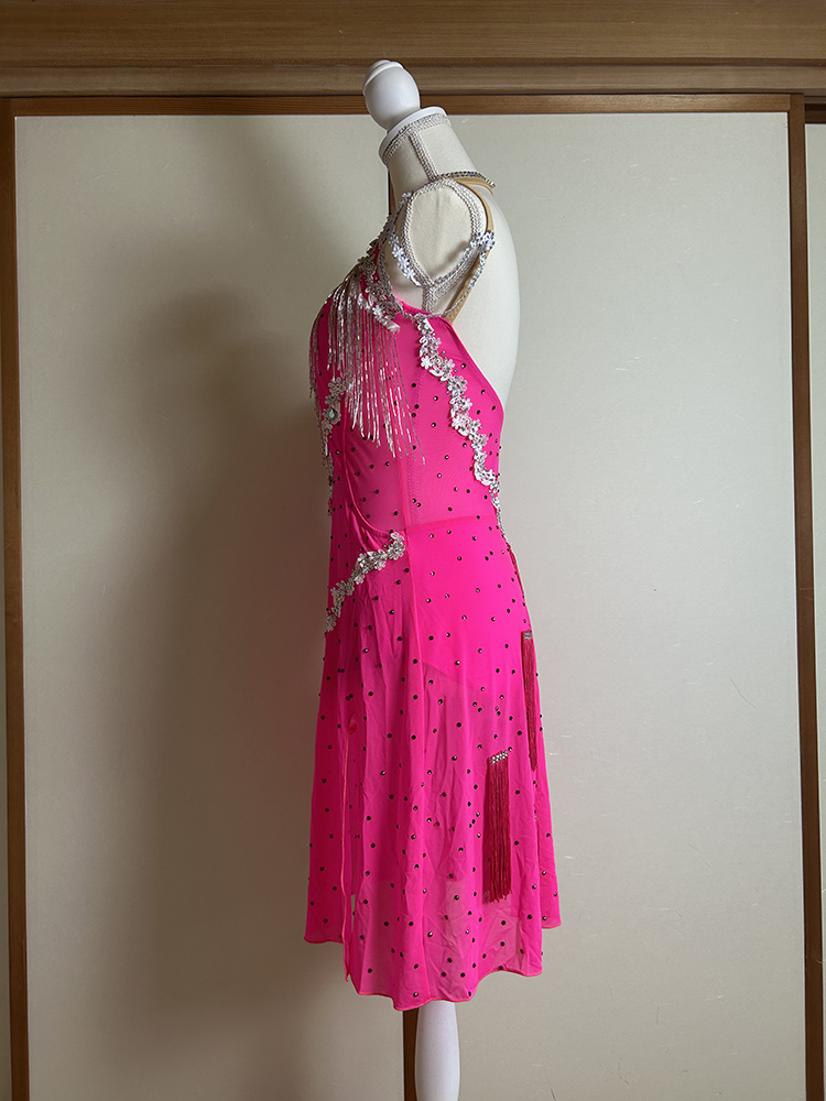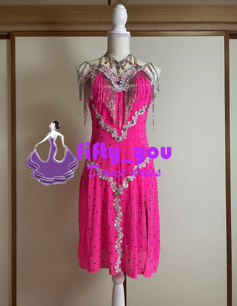 1円スタート新品 レディース社交ダンス用衣装 ラテン競技用可愛いワンピース 濃いピンク サイズM