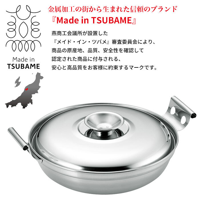 | 金属加工の街から生まれた信頼のブランド「Made in TSUBAME」 一人鍋にちょうどいいあつあつの鍋物や煮込みうどんにぴったりなステンレス製寄せ鍋17cmの2個セット。 IH200V対応。 「Made in TSUBAME」は燕商工会議所が接地した「メイド・イン・ツバメ」の審査委員会より、商品の原産地、品質、安全性を確認して認定された商品に付与される、安心と高品質をお客様にお約束するマークです。 |