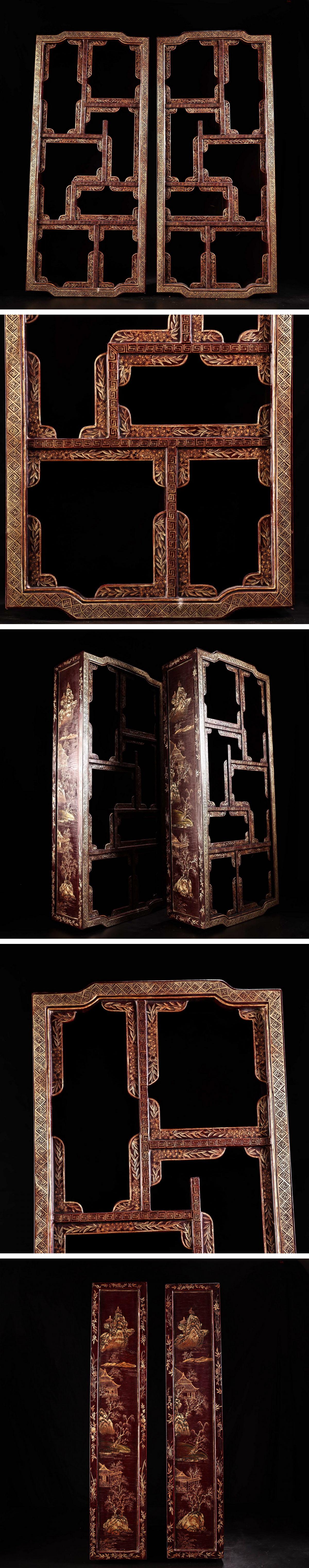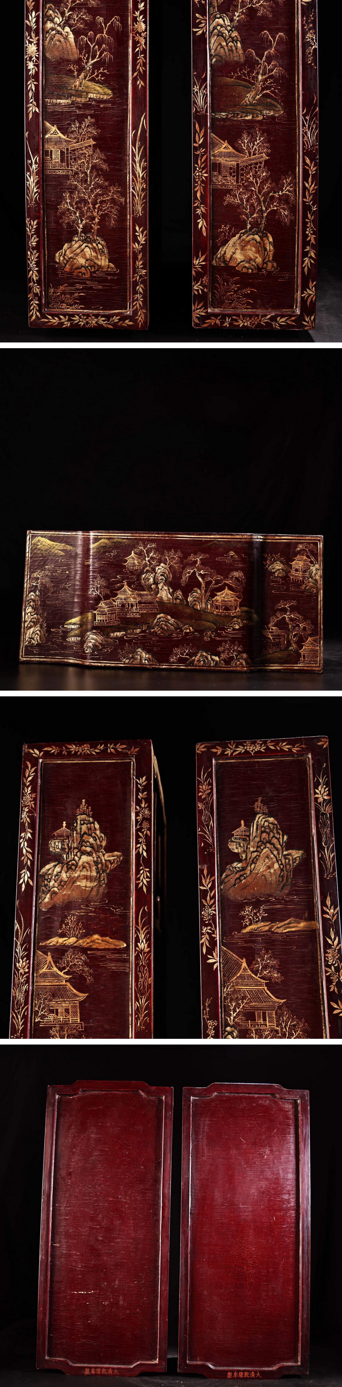 【清】某有名オークション購入 清時代 木胎漆塗 山水人物紋金蒔絵多寶閣一双 材質保証 古置物 古擺件 古美術 時代コレクション7L10-OD15