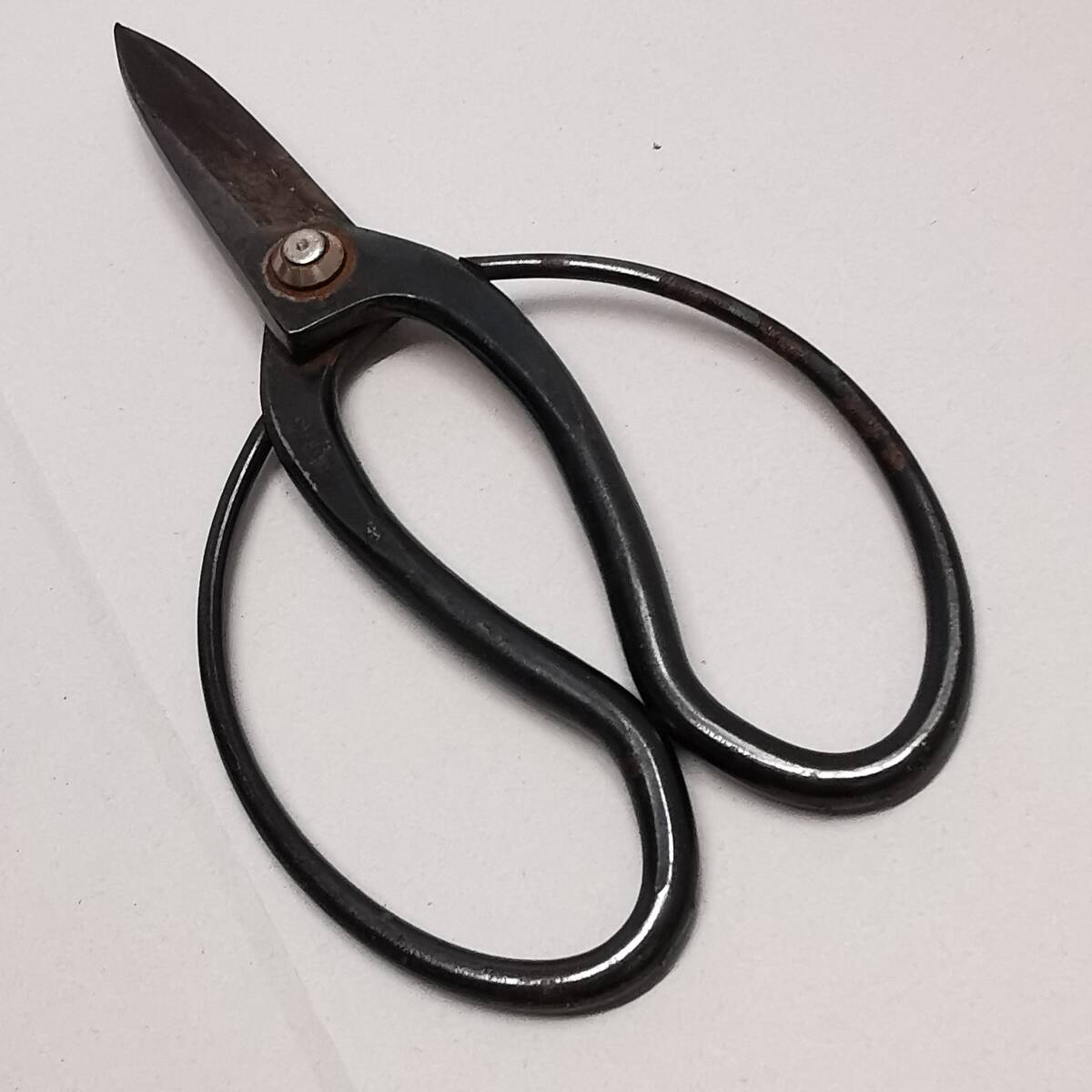 ◎日本の伝統形状の和鋏、刻印「秀房」の剪定ばさみです。大きすぎないサイズ感で、盆栽や庭木の細かな作業に扱いやすい一本です。