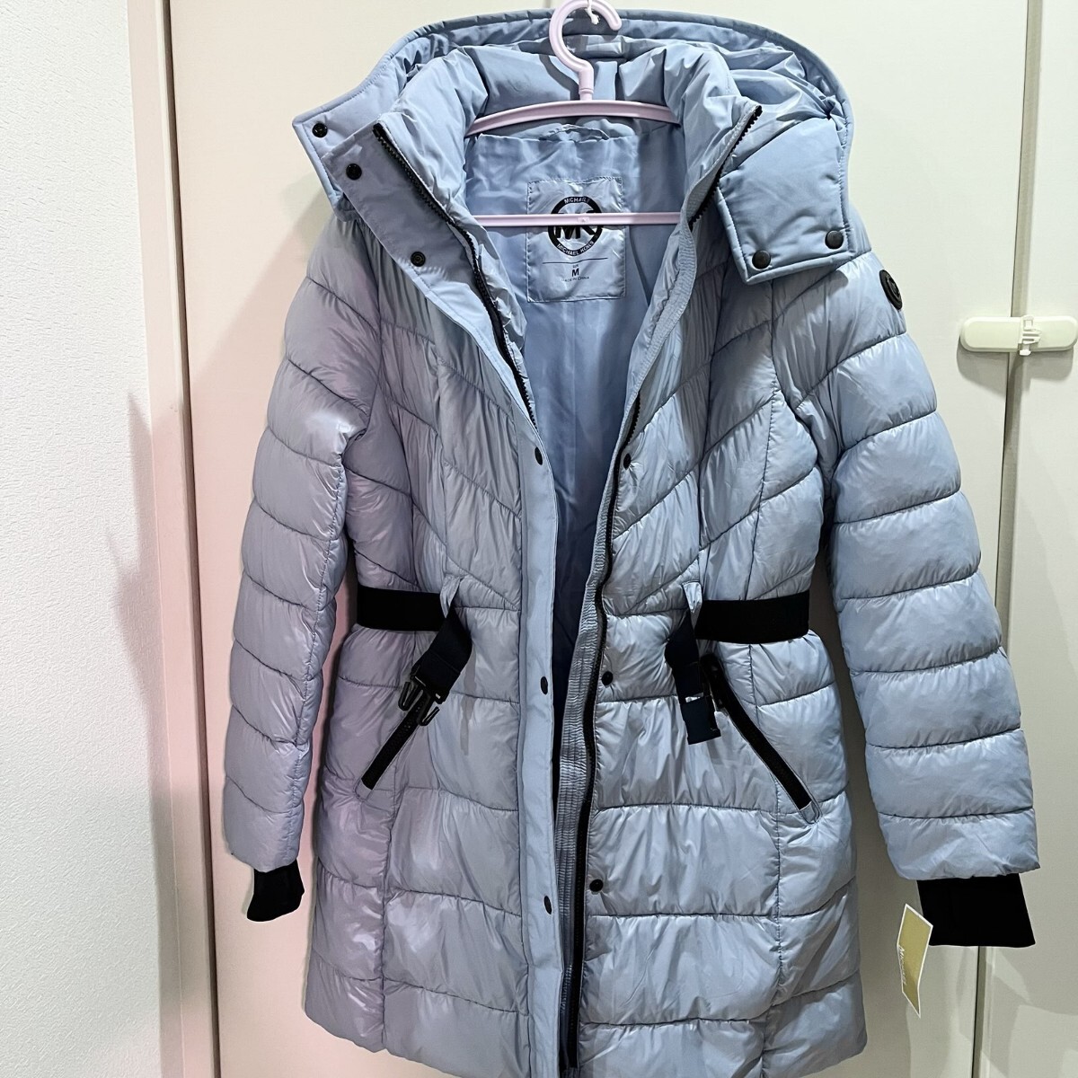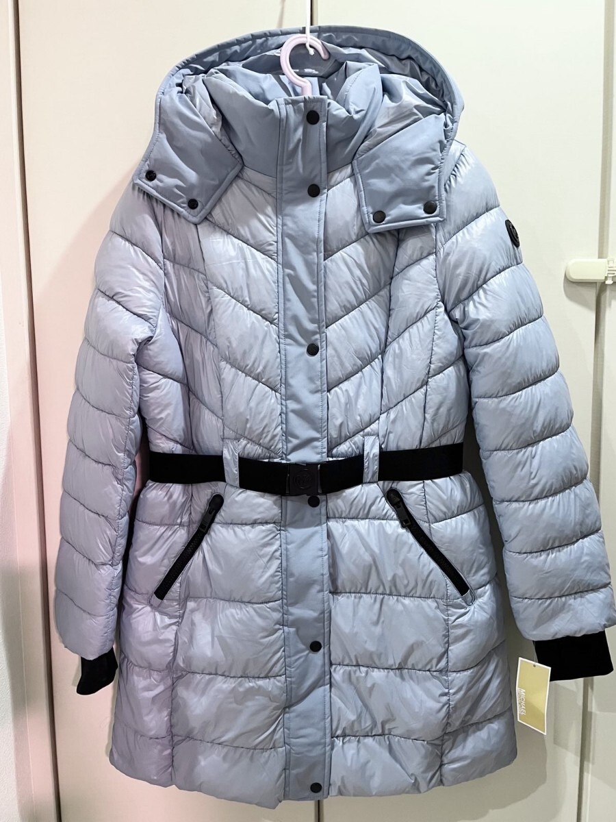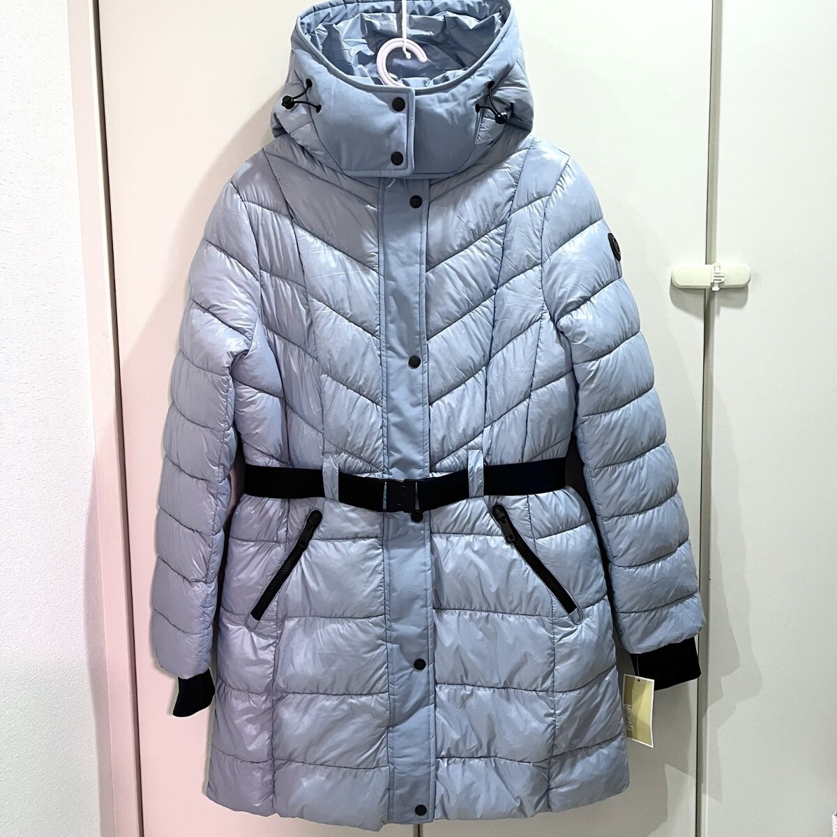 とてもお洒落なダウンジャケットです、袖のラバープレートがブランドをアピールし、フードに調節機能あり、取り外し不可。丈は膝上になります。