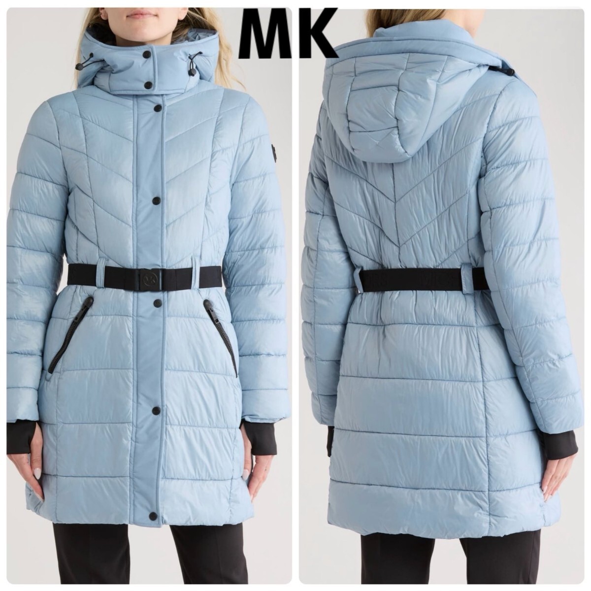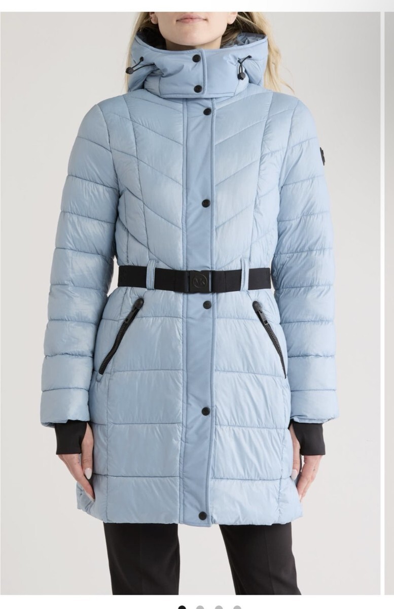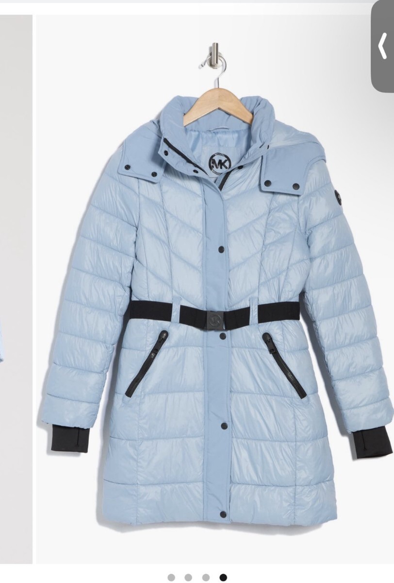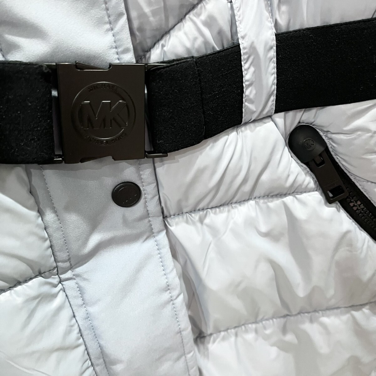 とてもお洒落なダウンジャケットです、袖のラバープレートがブランドをアピールし、フードに調節機能あり、取り外し不可。丈は膝上になります。