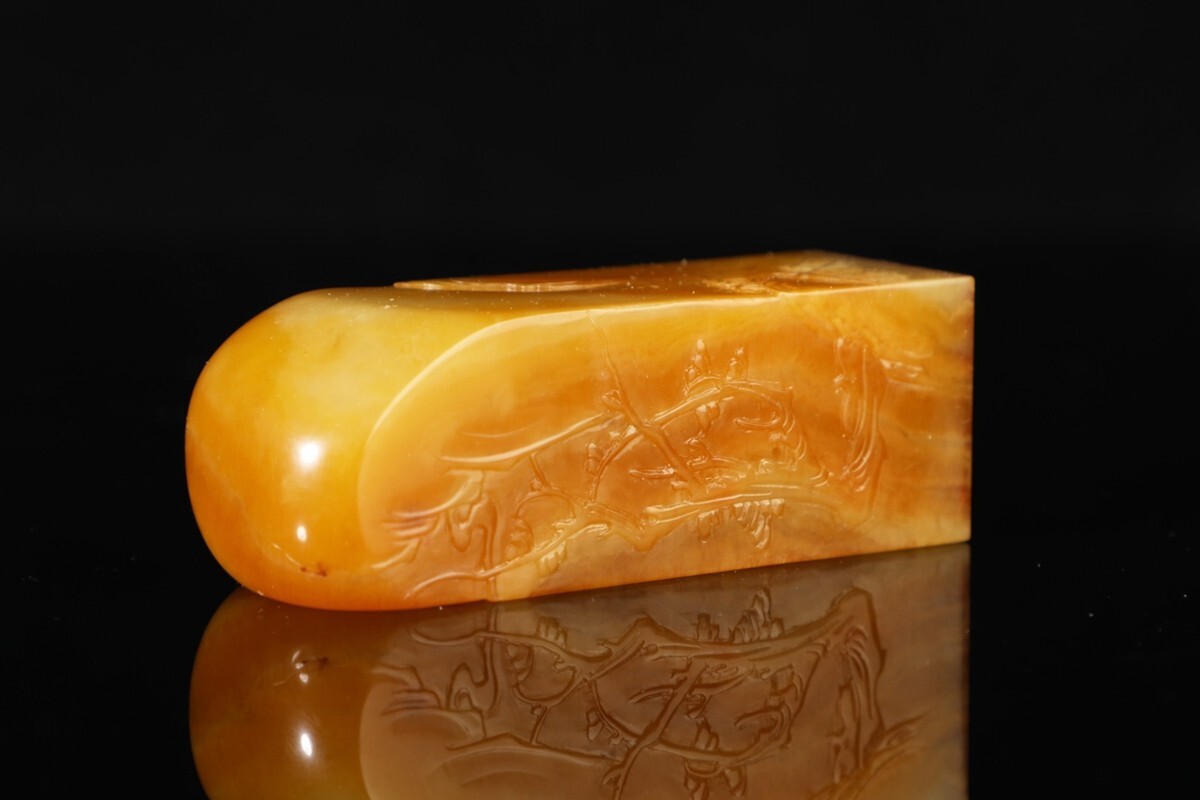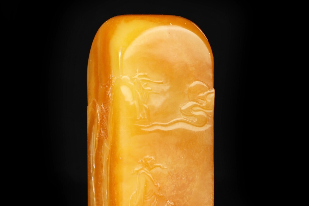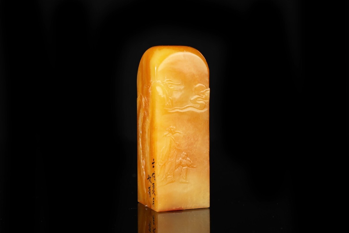 【瓏】寿山石 田黄石彫 山水人物印章 清代 牧甫 極細工 手彫り 置物擺件 中国古賞物 古美術 蔵出