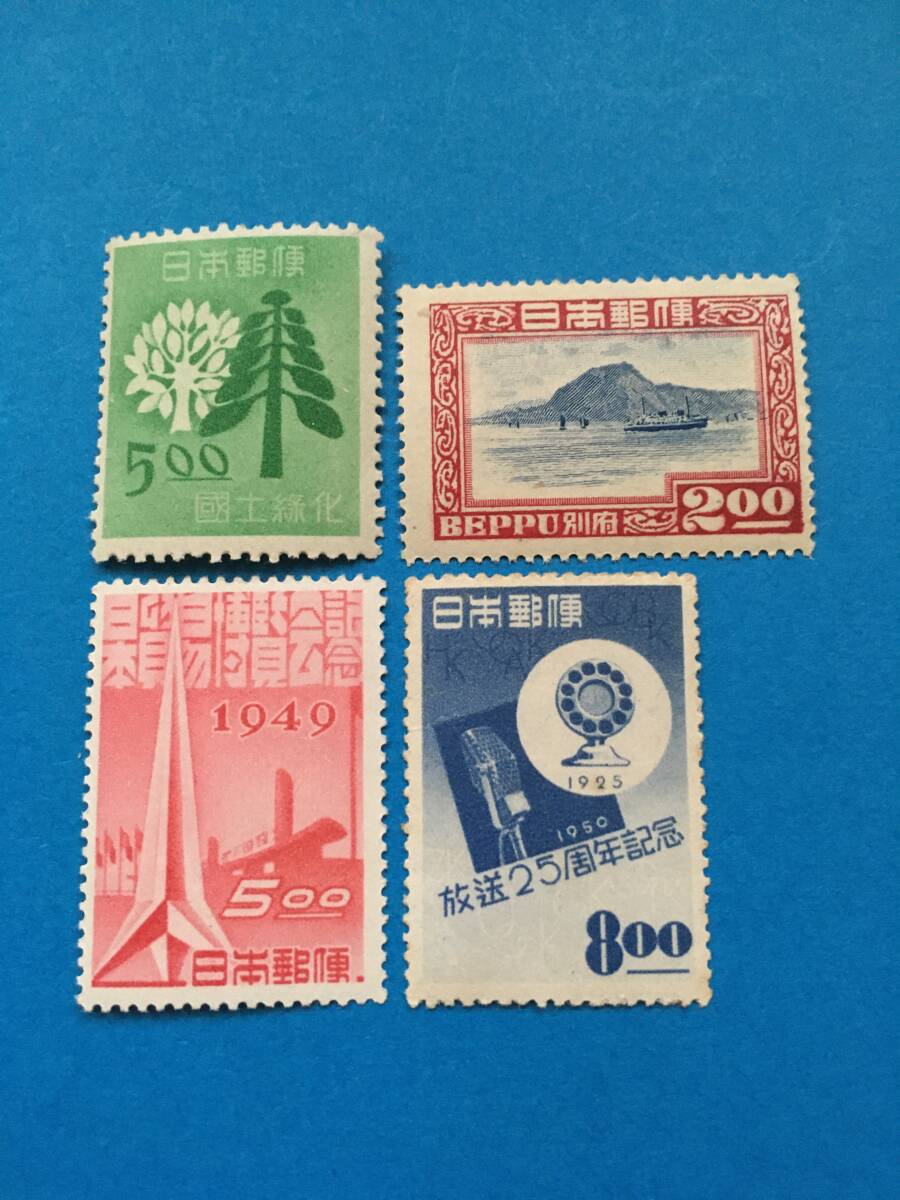 C257 古切手 記念切手 1949年 国土緑化運動+別府観光 5円+日本貿易博覧会記念 & 1950年 放送25周年記念 計4枚