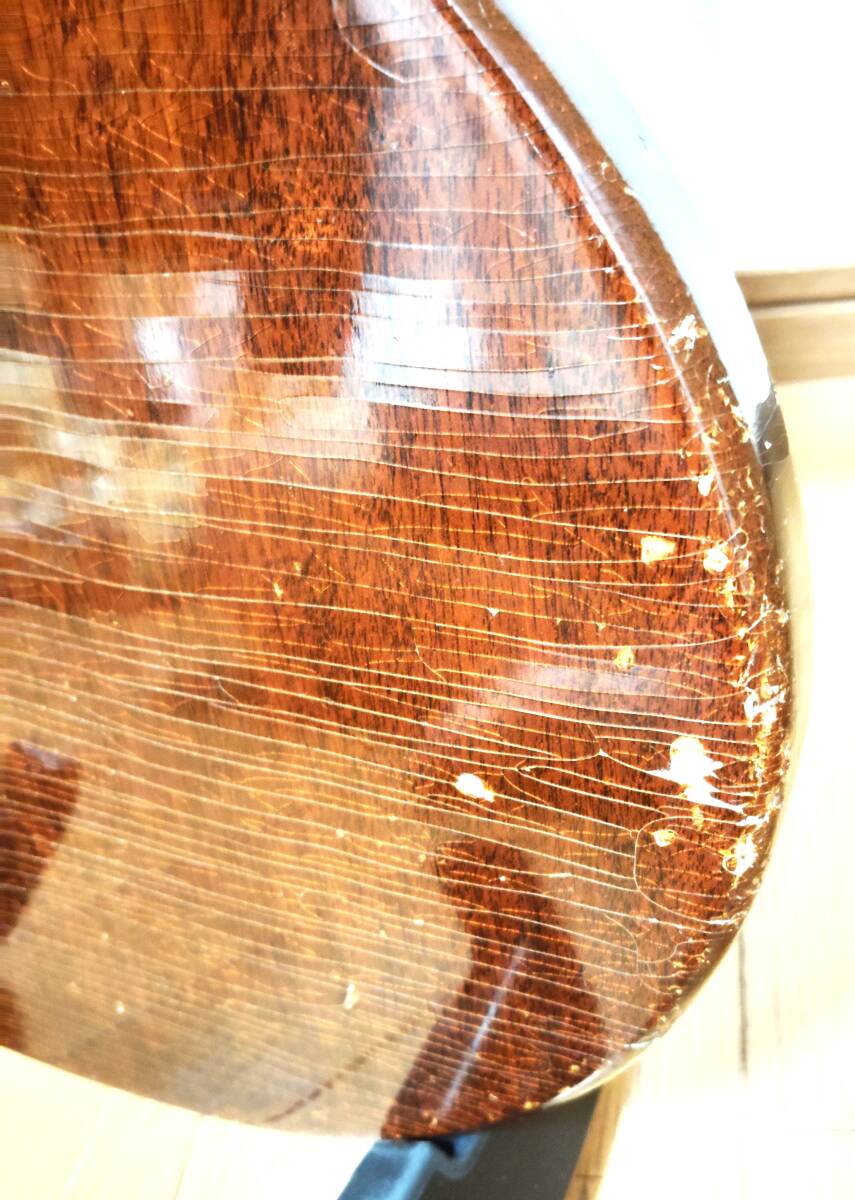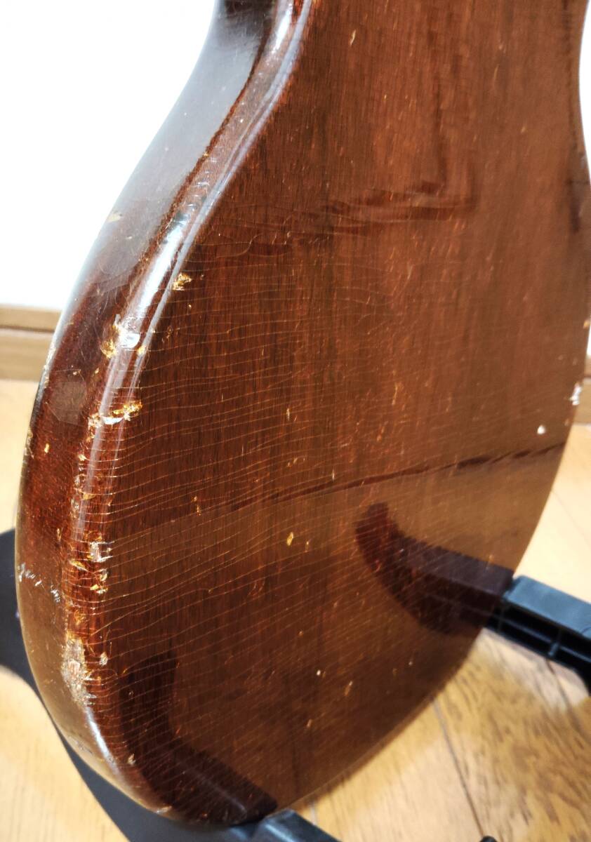 写真でご覧いただけるとように、ギター全体に、経年の傷、打痕など大きなものが沢山あります。