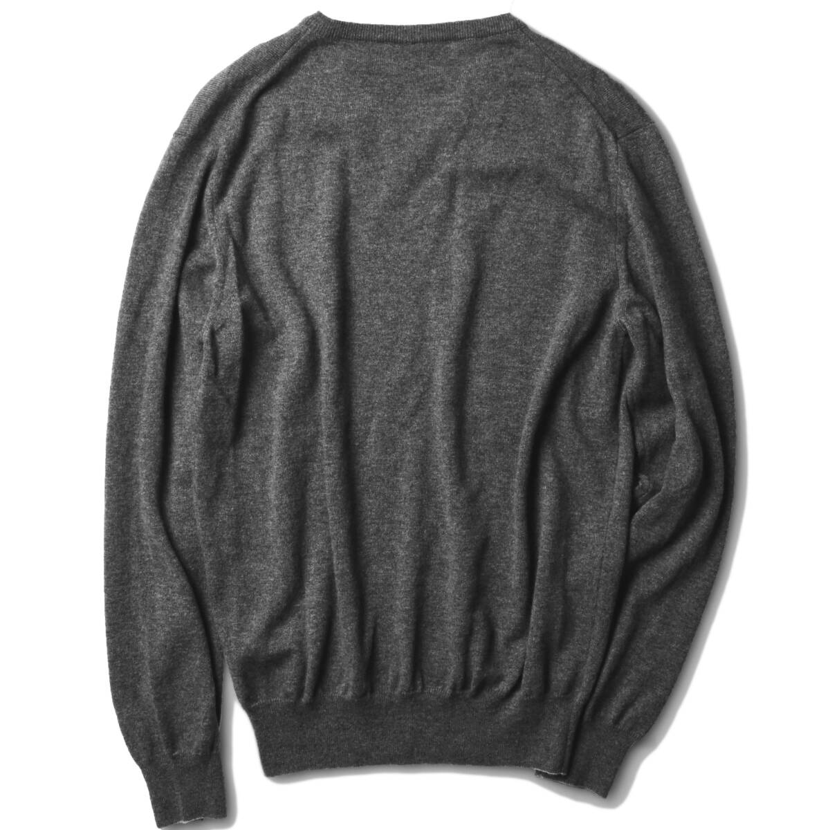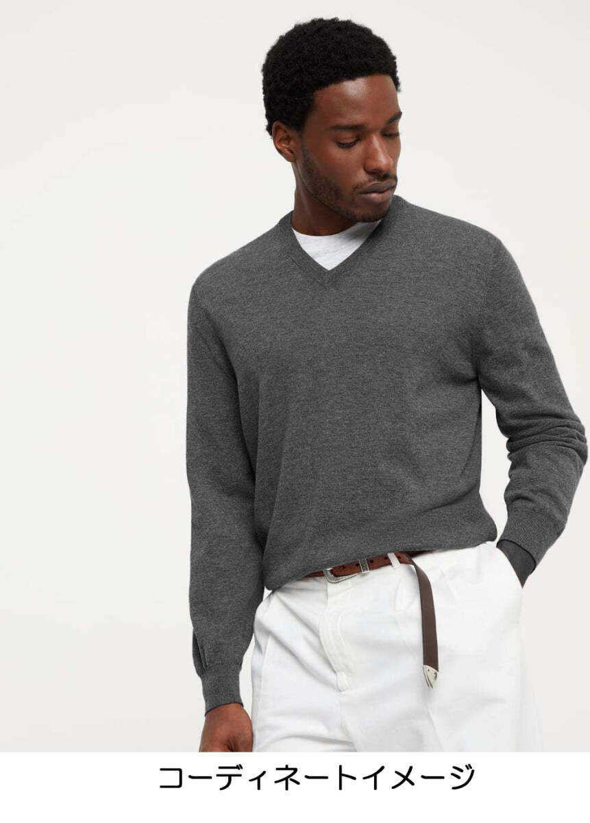 デザインは、縦横無尽に着回せるシンプル&ミニマムな『Vネックニット』 クルーネックとは違った印象のVネックは、首まわりをすっきり見せるスタイリッシュさで人気の定番アイテム。 V字のネックラインががセクシーな胸元を演出してくれることから、女性から高い支持を得ています。 狭すぎず広すぎずのVゾーンなので、シャツの合わせはもちろん、 クルーネックのTシャツやVネックのTシャツで首元の表情に変化を付けたレイヤリングにも大重宝です。 モデル画像のように、中に白Tを重ねヌケ感を作ってた王道スタイルが良く似合います。 ミディアムグレーの本体に、裾、袖のリブ端には、極細のライントリム()オフホワイトを差し、 ニットらしい柔らかなコントラストを付けたデザインで優雅な華やぎを着こなしにプラス。