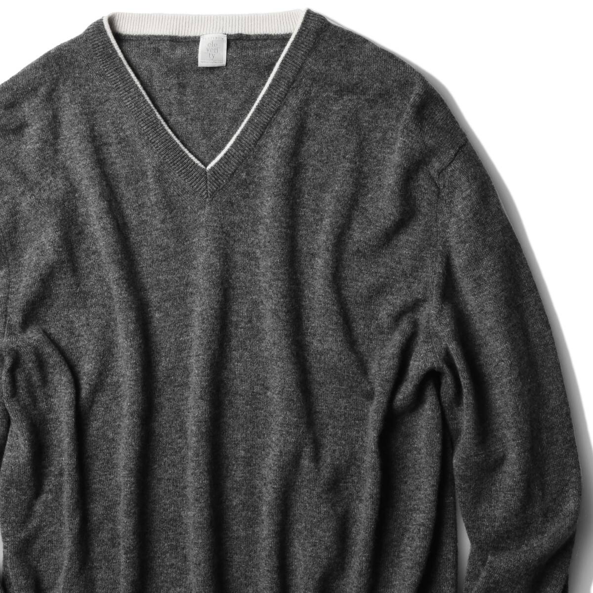 ドレスとカジュアルの中間をいく、大人っぽい優雅な雰囲気でイタリアの今を感じ取れるアイテムが多く、歴史の浅い、 現代的感覚を持ったイレブンティは、いかにもイタリア的な細身のフィッティング、的確な素材選び、 イタリア製にこだわりつつも、手ごろなプライスを実現。最近では大手百貨店や有名セレクトショップで 定期的にポップアップイベントが開かれるなど、今もっとも勢いのあるブランドのひとつです。 芸能界一の洒落者、イタリアンクラシコの第一人者¨峰竜太¨が愛用していることでも有名です。 本作、メインコレクションとは作る工場も本格サルトリア仕立てが可能なところに変え、 素材も高級素材にこだわりまくった最上級コレクション『PLATINUM(プラチナム)』からカシミアセーターのご紹介。