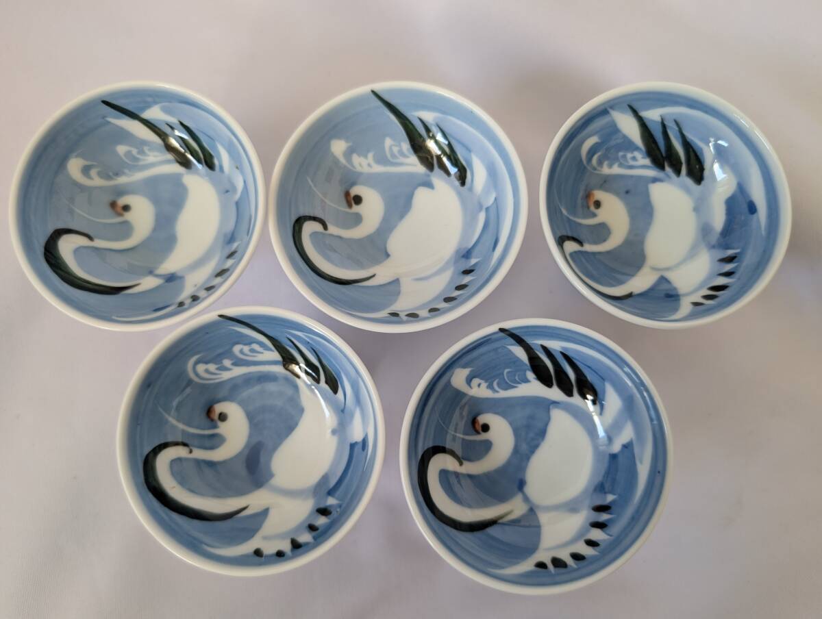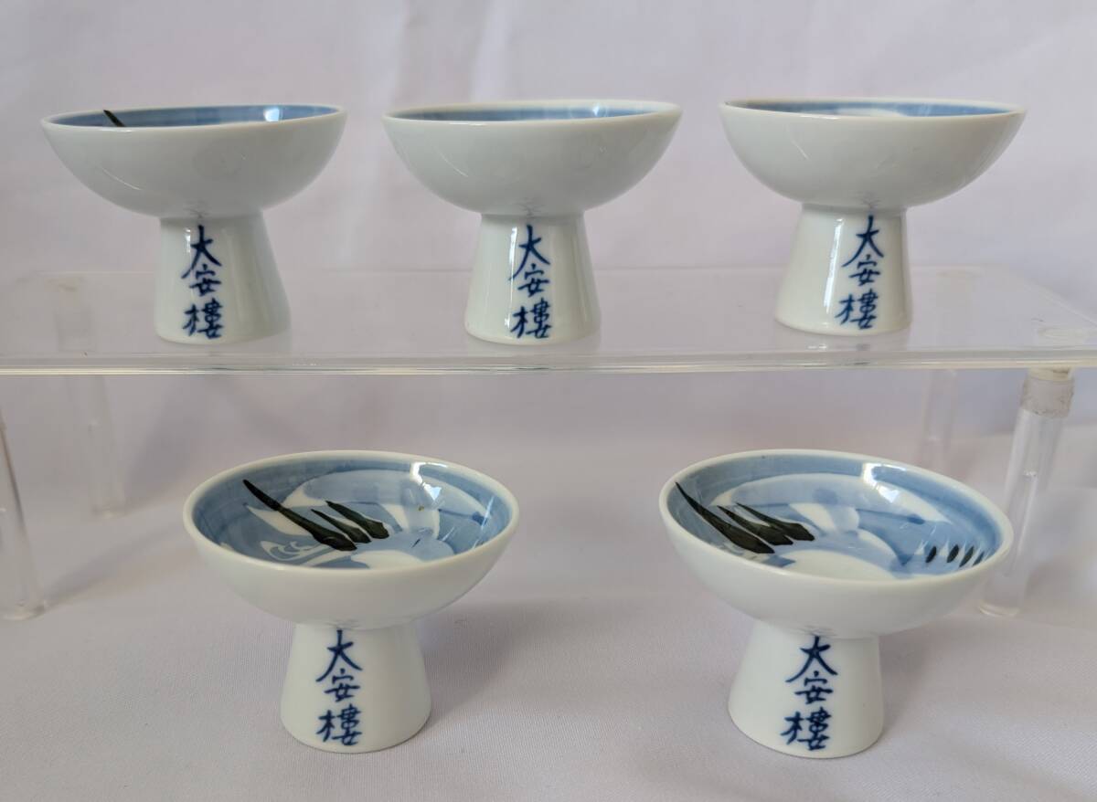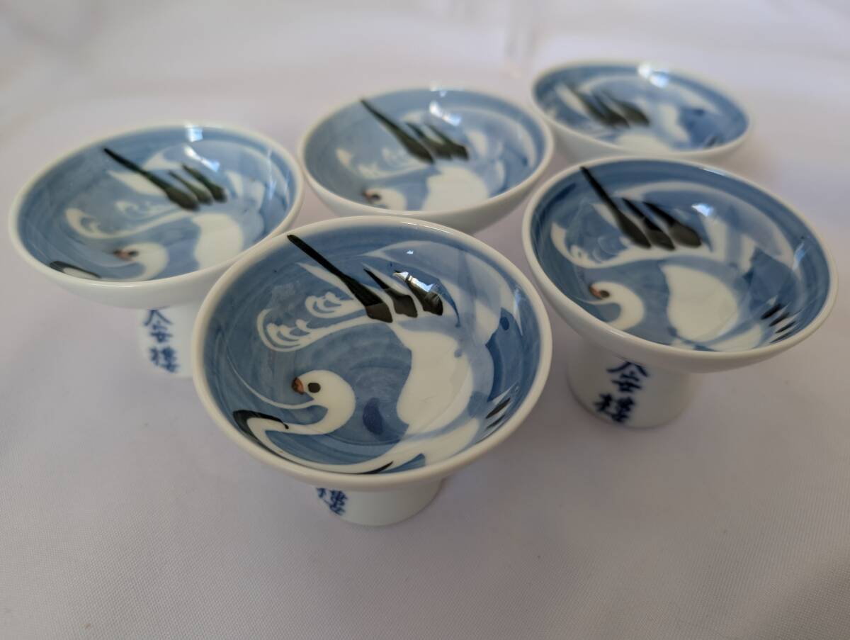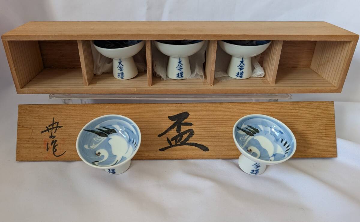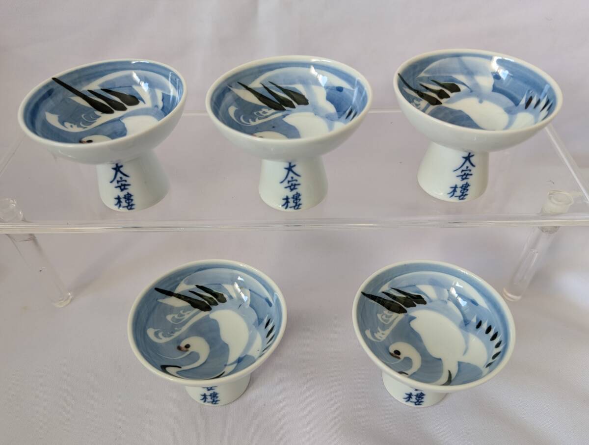 鶴図 高台 盃 お銚子 おちょこ お猪口  5客セット *染付 高台 足つき酒器 盃 杯 木箱入り 鶴絵図祝席に/祝い膳