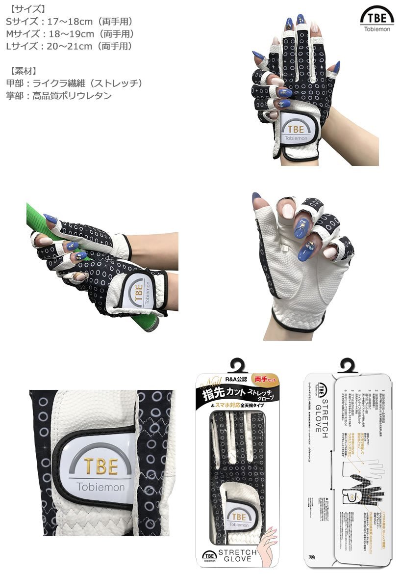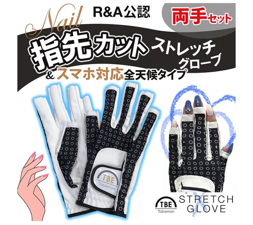 ファッションにこだわりを持つ大人女子ゴルファーにおススメ、指先をキュートに演出するネイル&スマホ対応全天候タイプの両手セットグローブです。