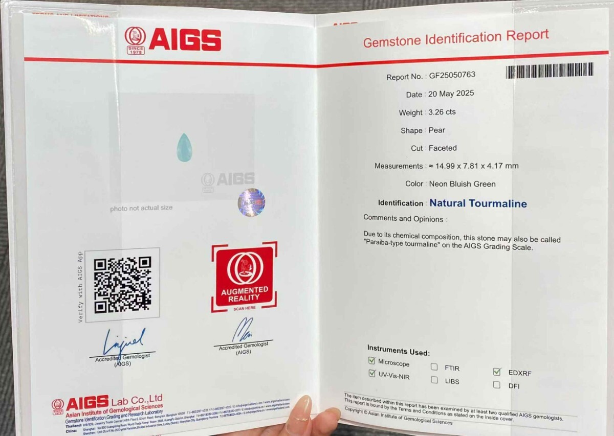 国際鑑定書付きで品質を保証。実物は光を受けるたびに、より鮮やかなネオン光彩を放ち、写真以上の衝撃的な美しさをご体感いただけます。