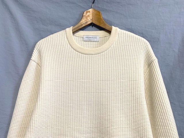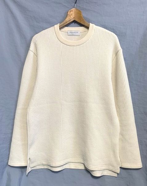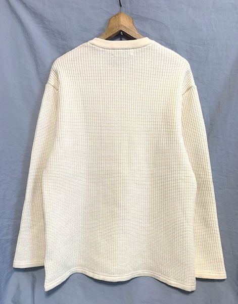 ポリエステルウール混の糸でしっかりと編み込まれたハリのあるワッフルサーマル生地のニットプルオーバーです。適度なハリと伸縮性もあり、型崩れしにくいものになっており、スマートな印象を長く保って着ていただけます。裾はサイドにスリットが入った直線カット、身幅と肩幅は広めなナチュラルなサイズ感です。ワイドなコーディネートを上品に着こなしていただけるアイテムです。伸縮性も高く、暖かさもあり、単体ではもちろん、インナーとしても優秀なアイテムです。カラーもワッフルサーマル生地とマッチしたナチュラルなオフホワイトです。綺麗な状態で出品させていただきますので、是非、ご活用いただけたらと思います。