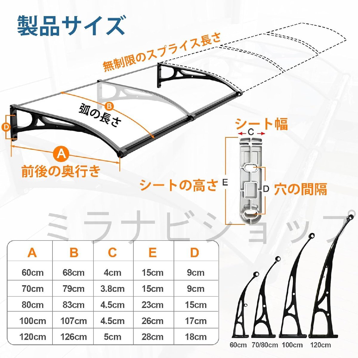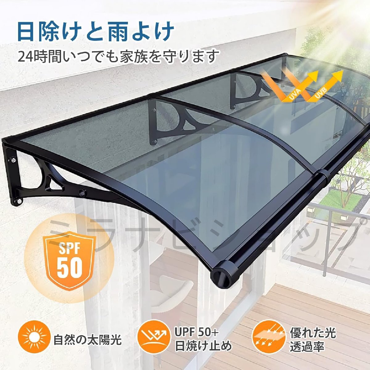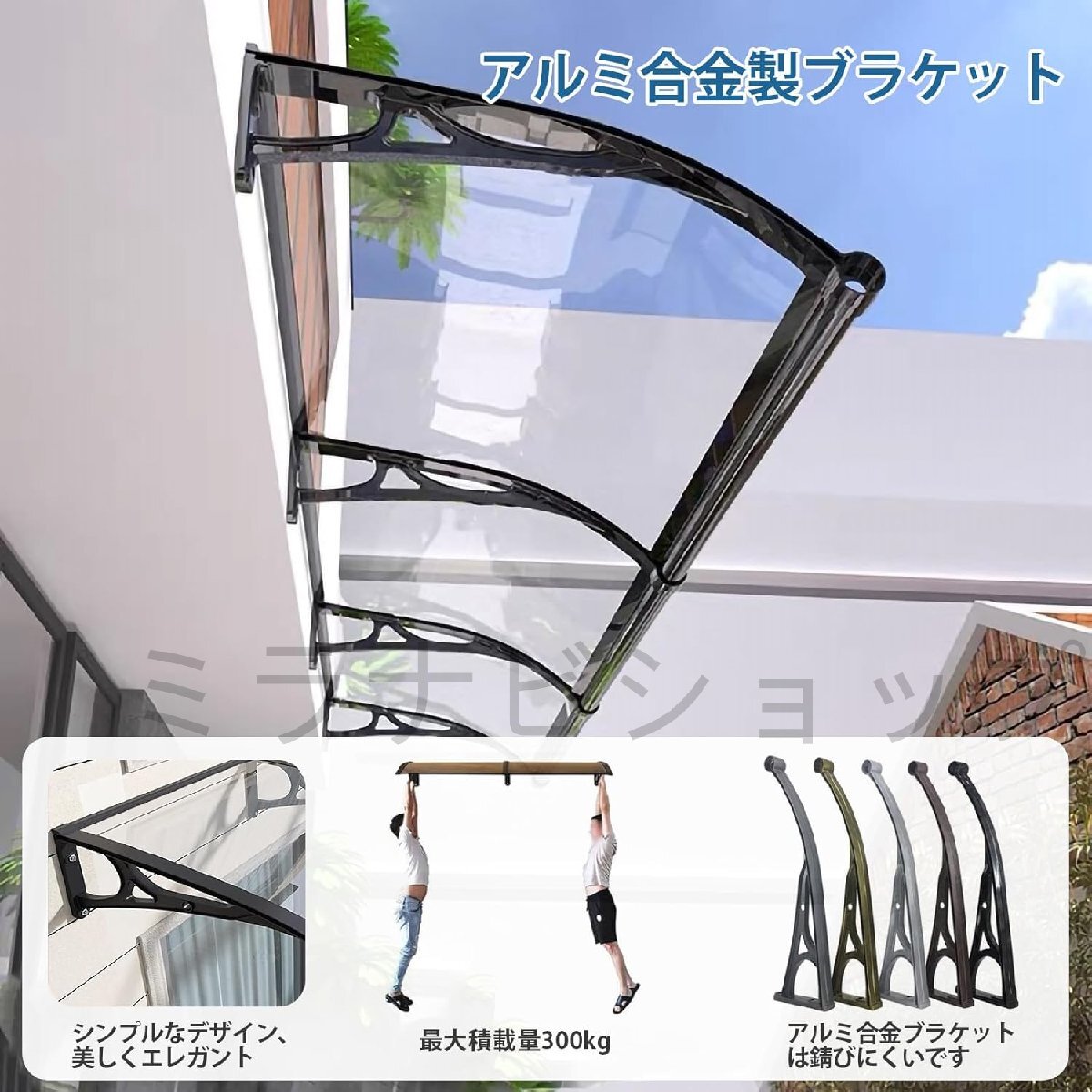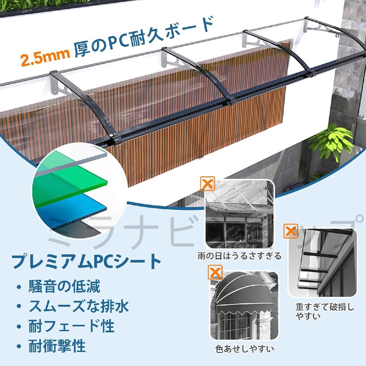 耐久性のある素材: ひさし 雨よけ 後付けは透明なポリカーボネートパネル、アルミ合金ブラケット、およびバーで作られており、強風や豪雨、雪にも耐えます; 屋根ひさし 雨よけ 最大100kg/220lbsまで耐え、騒音のない 屋根 後付け を提供します