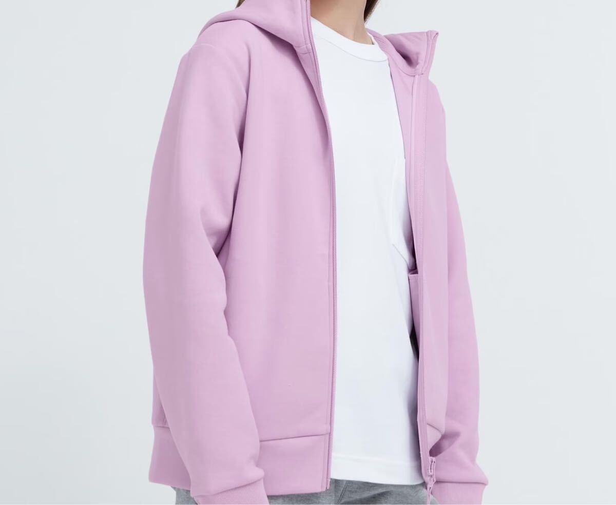 ライトパープルカラーのシンプルなジップアップパーカーです。肌触りの良い素材で、カジュアルな普段使いにぴったりです。春先や秋口の羽織りとして活躍します。