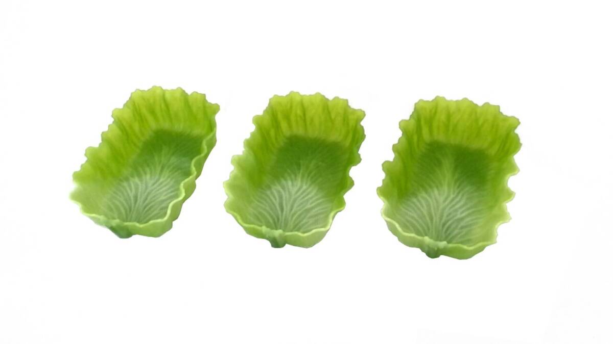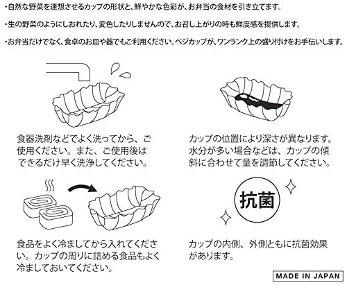 お弁当に色味がほしい時、パーティで盛り付けにもう一工夫したいときのソースカップに 生野菜をおかずの仕切りにすると、しおれたり水分が出たりしますが、ベジカップはきれいなまま 自然の野菜を思わせる鮮やかな形状と色彩は、様々な食材を引き立てます 柔らかすぎない絶妙な質感で、食材をさっと乗せやすく、ソースなどの液体もこぼれない カップには抗菌効果があり、食中毒の原因となる大腸菌などの発生・生育・増殖を抑制します