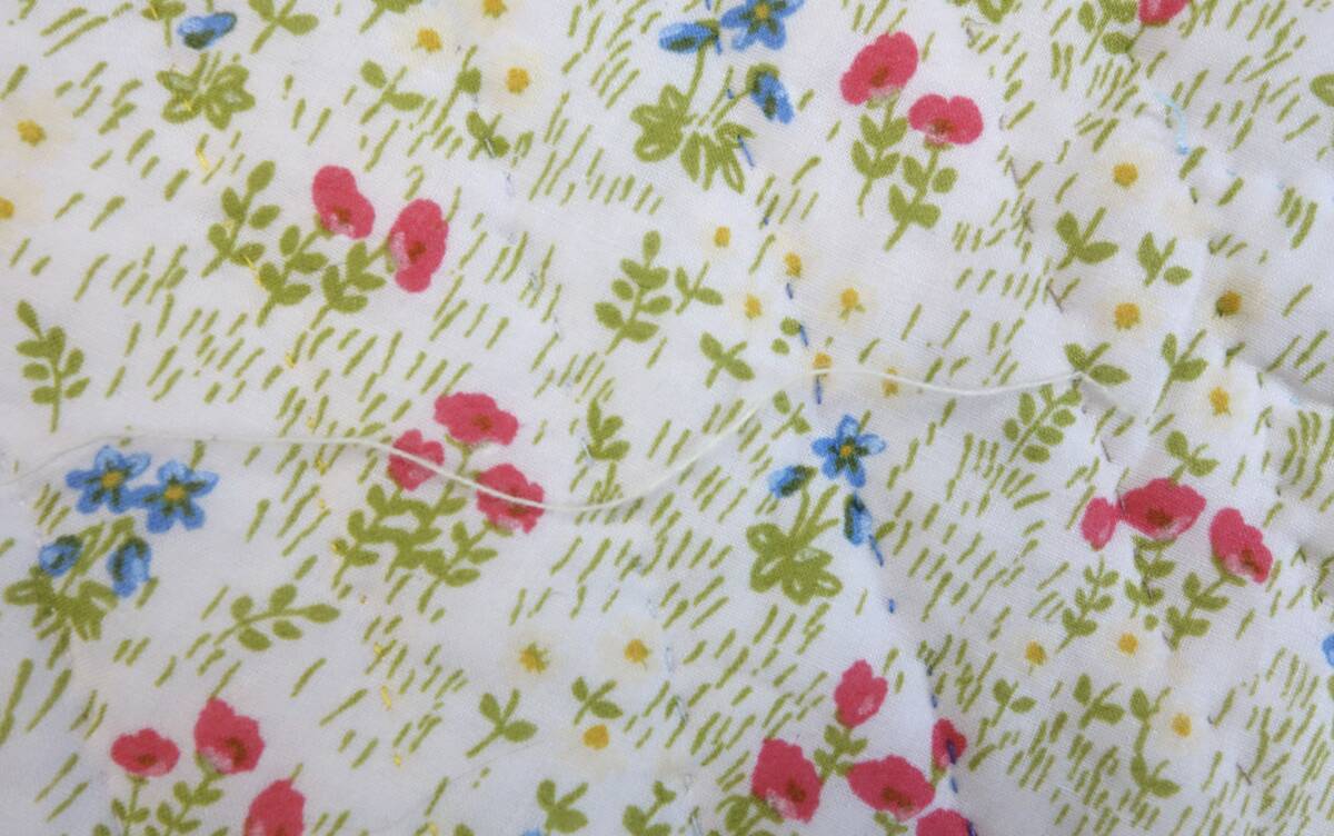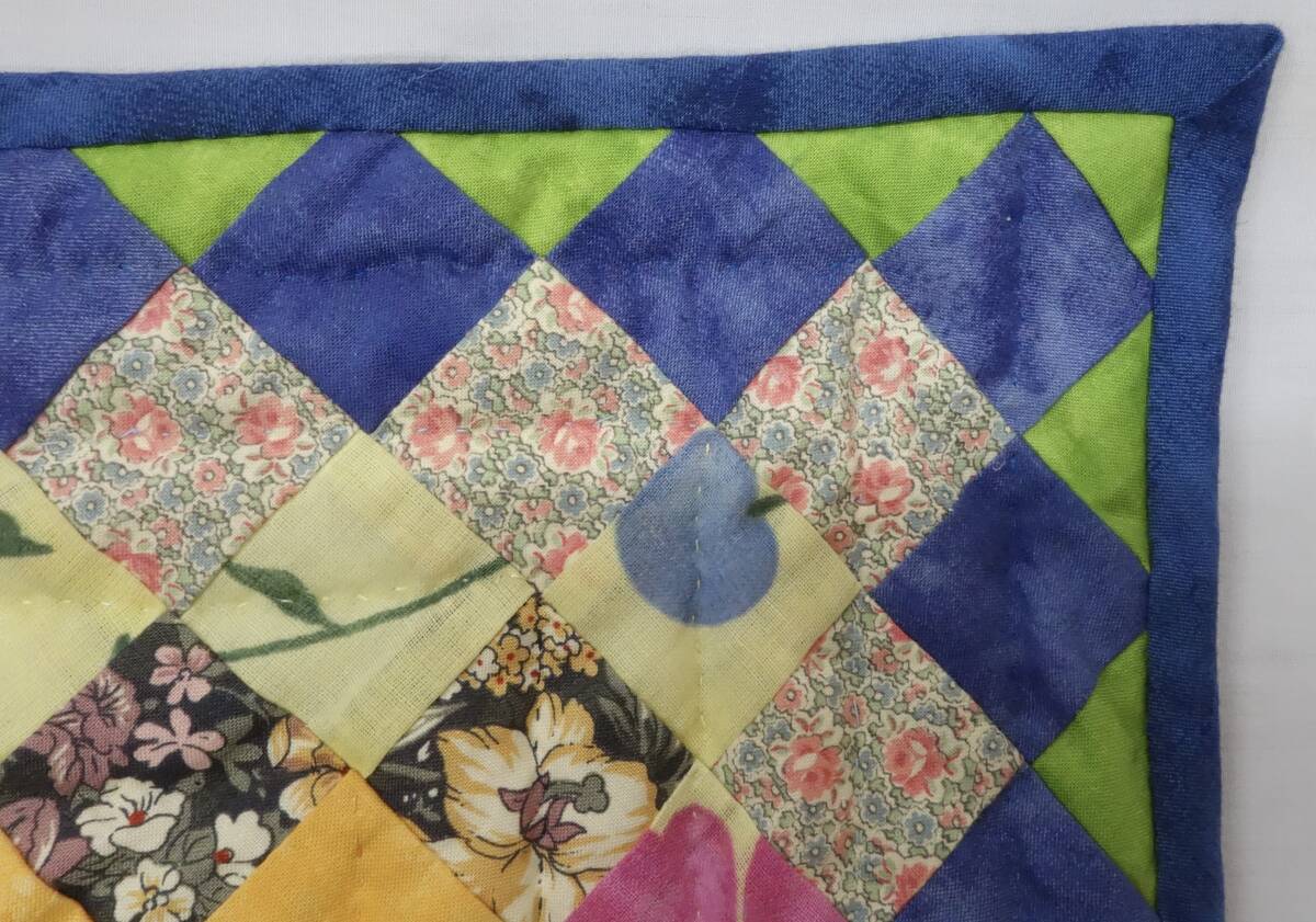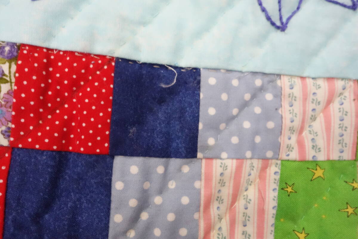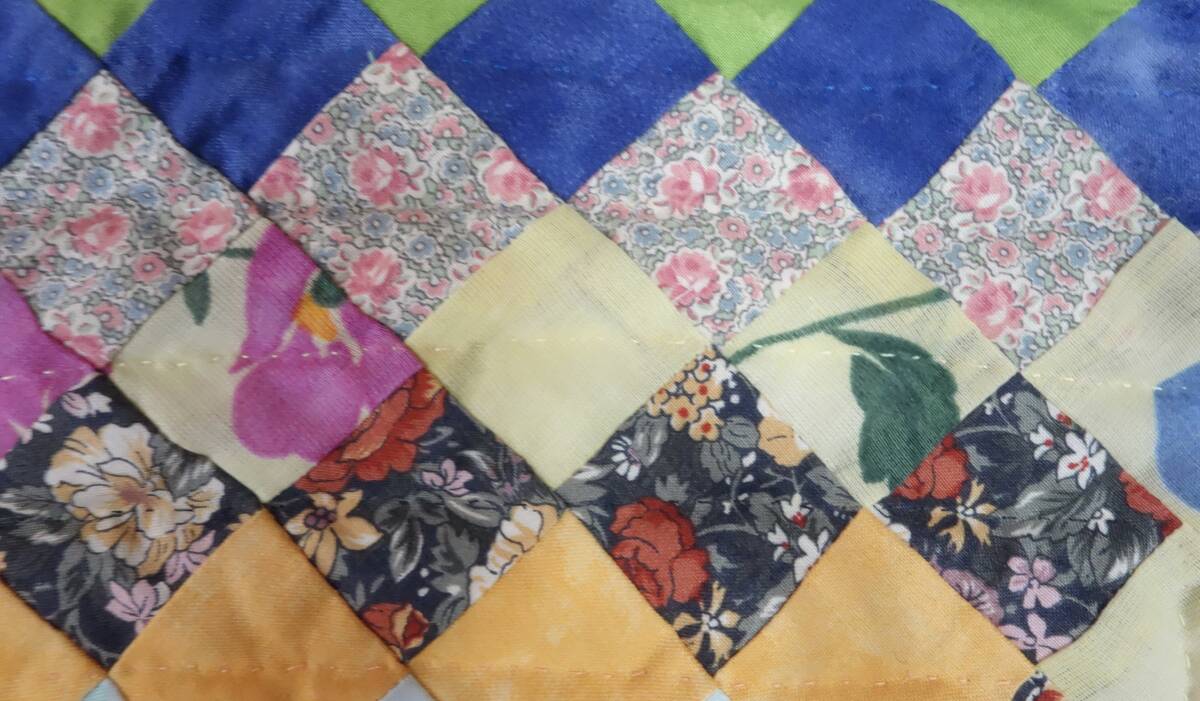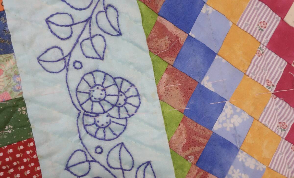 すべて手縫いで丁寧に仕上げられた大作で、繊細なパッチワークの技術が随所に見て取れる逸品です。