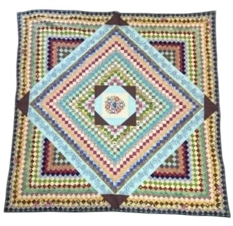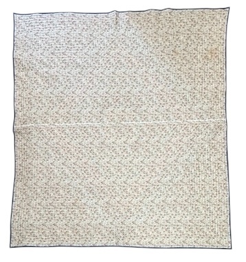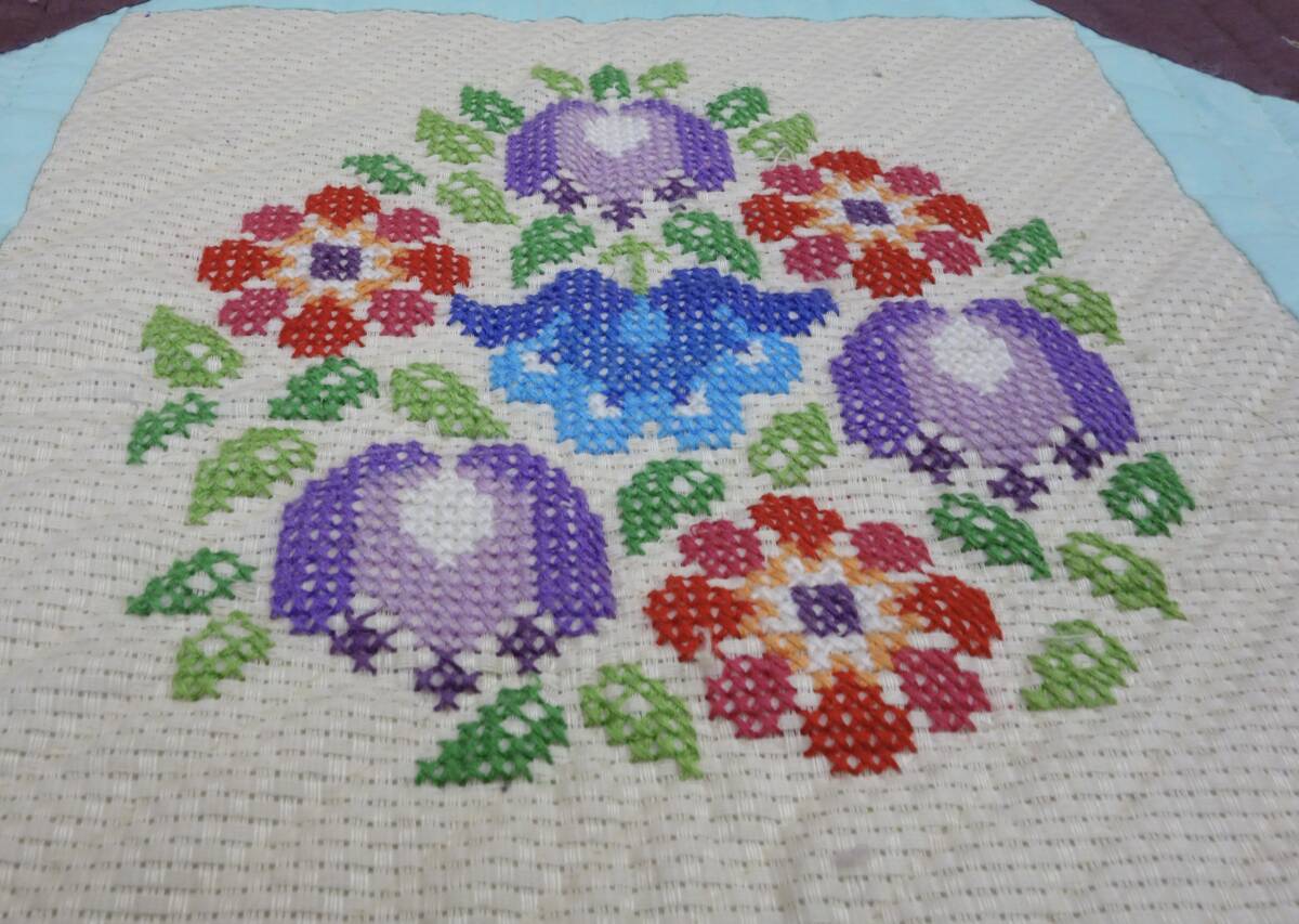 中心に花柄刺繍を配し、周囲を小さな四角形で緻密に構成したビンテージキルトです。