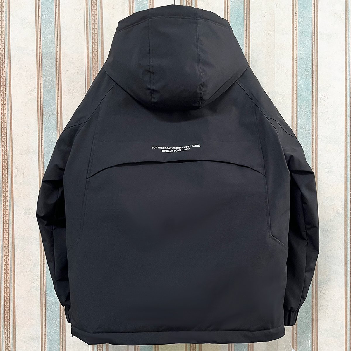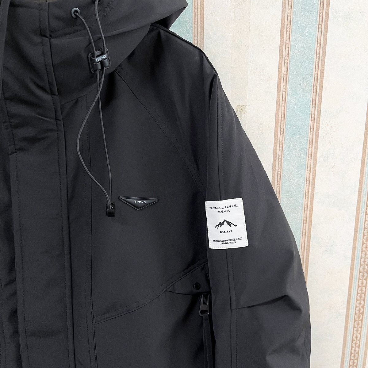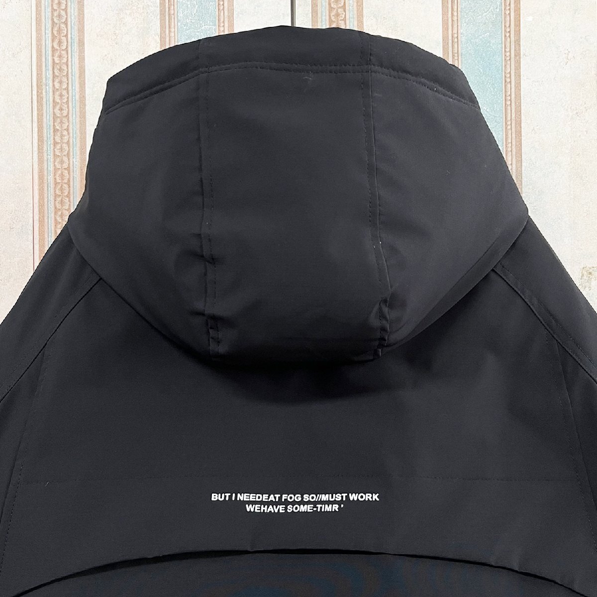 ダウンジャケットと一体のフードと裾には、ドローストリングが付いており、引き締めることで寒風の侵入を防ぐことができます。両サイドには大容量のジップポケットがあり、収納力が抜群です。内側には隠しポケットもあり、貴重品を安心して収納できます。左袖とバックの英字はポイントで、カジュアルスタイルがこなれ感のある印象に。