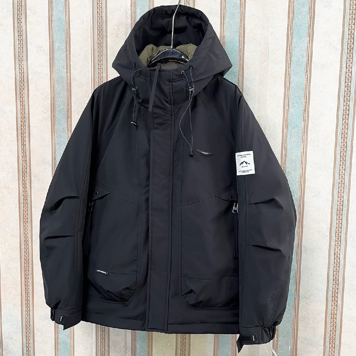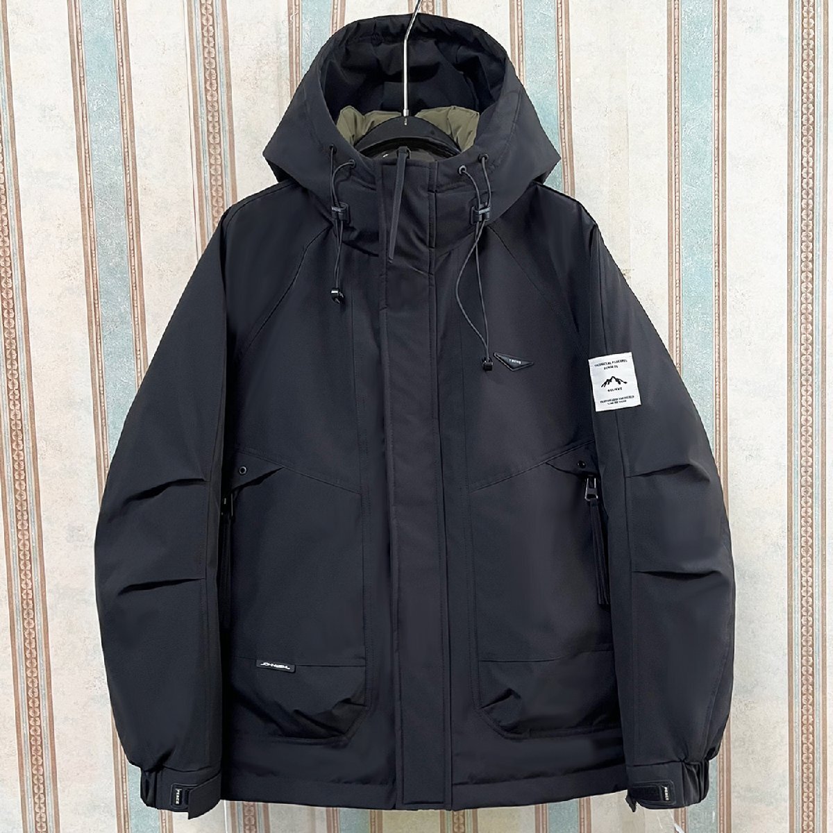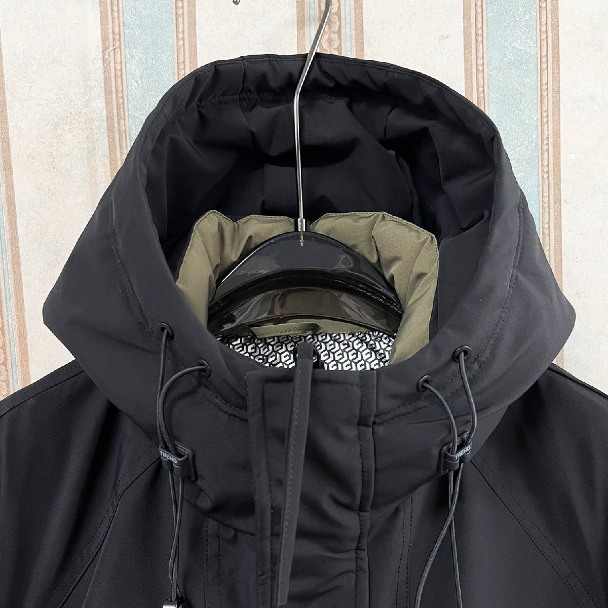 ダウンジャケットと一体のフードと裾には、ドローストリングが付いており、引き締めることで寒風の侵入を防ぐことができます。両サイドには大容量のジップポケットがあり、収納力が抜群です。内側には隠しポケットもあり、貴重品を安心して収納できます。左袖とバックの英字はポイントで、カジュアルスタイルがこなれ感のある印象に。