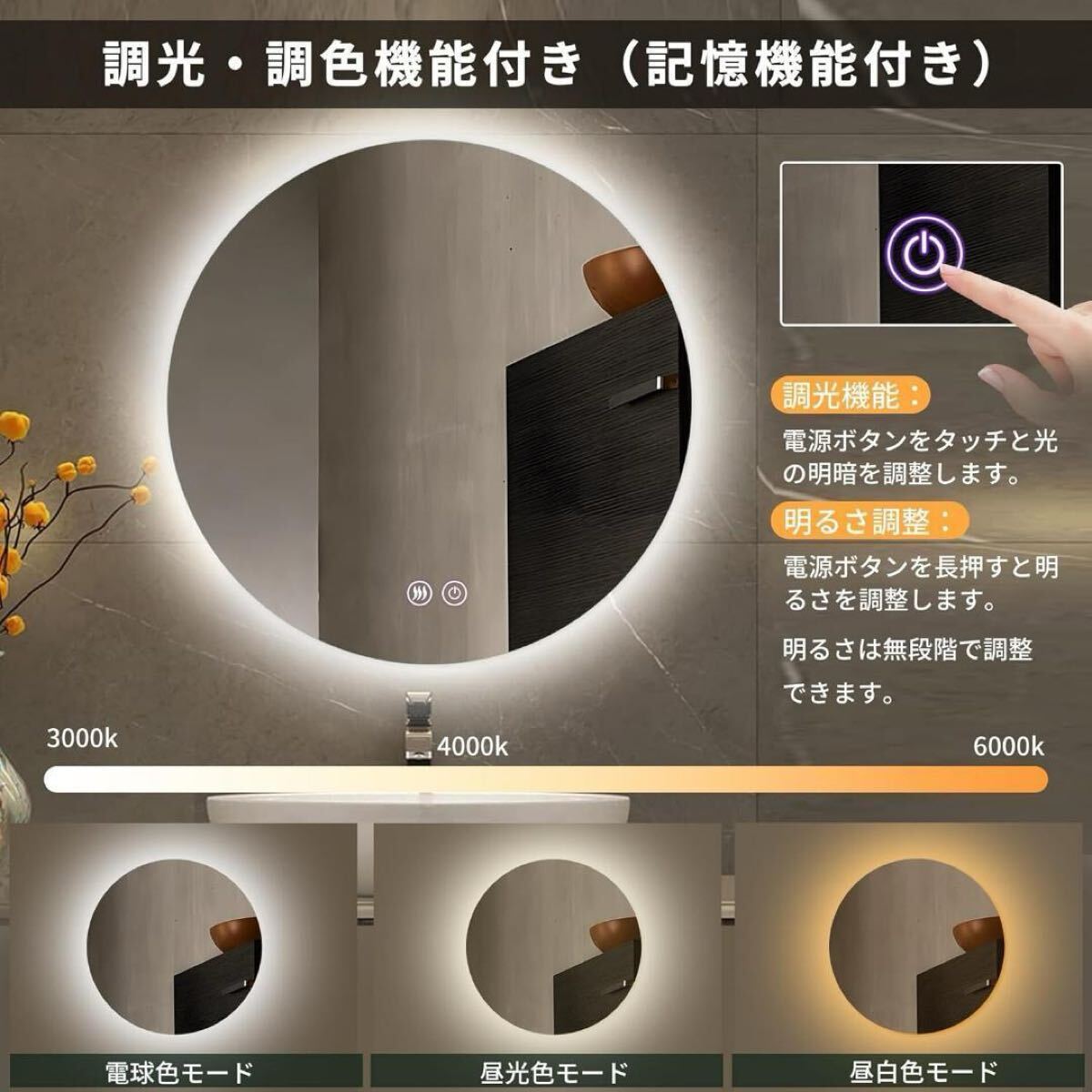 【高機能なLED鏡で明るさ調整自由】このLEDミラーは、3種類の調光機能を搭載しており、明るさや光の色温度を自由に調整できます。昼白色、暖色、白色の3つの色合いから選べ、用途に応じて最適な照明環境を提供します。化粧や髪型のセットに最適です。