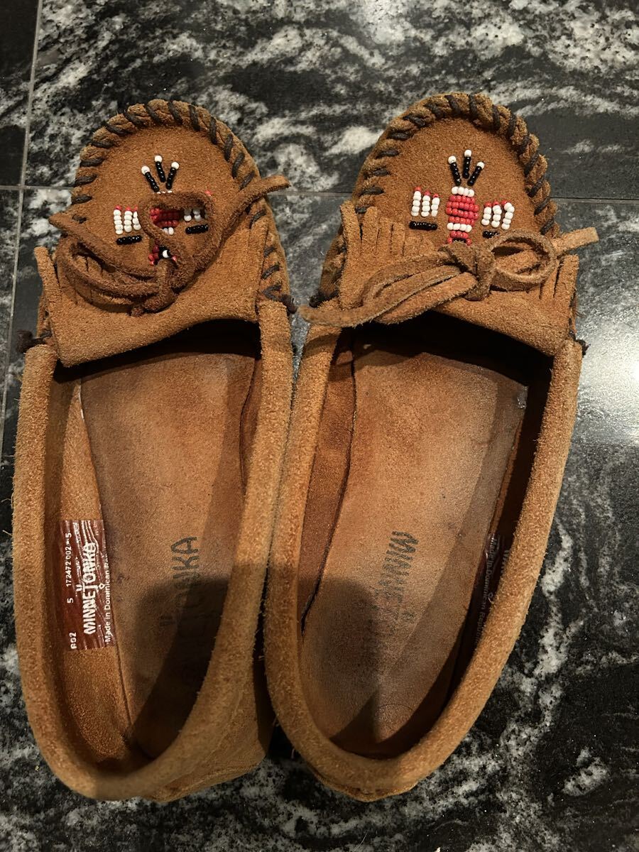MINNETONKA(ミネトンカ)のモカシンです。ブラウンのスエード素材にカラフルなビーズがあしらわれたデザインが特徴です。インソール部分には使用に伴う汚れが見られます。