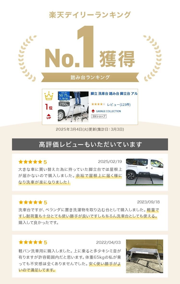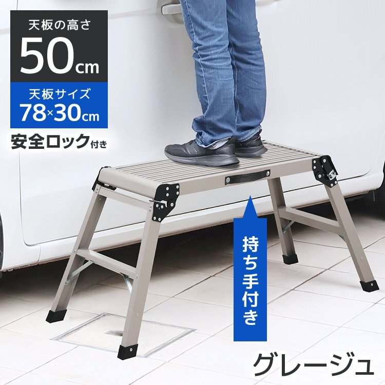 天板裏とステップには金具で補強を施し、安心して作業できる強度を実現しました。 \その他、安心安全ポイント/ ・天板、ステップ、脚キャップに滑り止め加工済 ・しっかり固定できる安全ロック搭載! ・幅広ステップで安定感抜群 ・安心の耐荷重150kg 女性でも片手で持ち運べる軽量設計! また、ブラックには持ち手付きで持ち運びやすさ抜群です。 水に濡れてもサビにくく丈夫なアルミ製で、様々な作業に使用可能。 その他、荷物置きや作業台、ベンチとしてもご使用いただけます☆ 【商品仕様】 《サイズ(約)》 全体:幅108.5×奥行40×高さ50cm 天板:幅78×奥行30cm 折りたたみ時:79×16.5cm 重量(約):3.6kg 耐荷重(約):150kg 材質:アルミニウム、ABS樹脂、プラスチックメッキ (アルミ足場台 アルミ脚立 アルミ洗車台 ラダー アルミラダー 高所作業 掃除 そうじ 大掃除 雪おろし ガーデニング 作業 洗車 日曜大工 避難 多目的はしご 折り畳み 人気 おすすめ WEIMALL) |