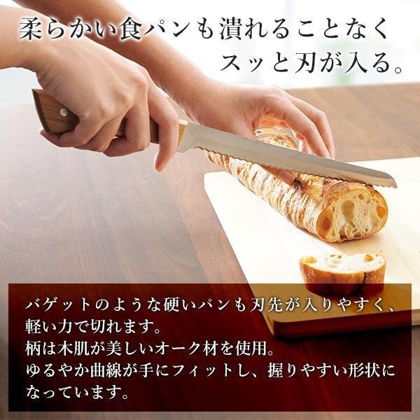 | 食パンもバゲットも軽い力で、スッと美しくスライス。 タフで丈夫なステンレス刃+温もりの木製ハンドル。 | ||||||||||||||
