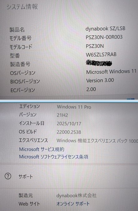 | -------------------------------------------------------------- 上位CPU、第11世代 インテル Core i7-1165G7 プロセッサー(Tiger Lake)搭載! 【メーカーサイト】 https://dynabook.com/direct/pc/catalog/2021-spring/szls/feature.html ★最新OS[Windows 11 Pro 64ビット 正規版]搭載! オークション上に溢れているWindows11のシステム要件をクリアしていない旧いPC(第8世代以前のCPU搭載PC等)に 強制導入している非対応粗悪品ではなく、Windows11のシステム要件をクリアしている安心・安全なWindows11対応PCです。 (Windows11を強制導入してある非対応・旧型PCは今後重要な月例セキュリティアップデートやサポートが一切受けられない可能性が高い非常に危険なPCです) https://pasokn.jp/2022/11/30/windows11/ https://www.nichepcgamer.com/archives/windowsupdate-in-windows11-has-the-ability-to-stop-providing-updates.html ★ワープロや表計算などを含むオフィス統合環境ソフト[OpenOffice]導入済! ★『送料0円』になる[即決落札価格]も設定しているので【早い者勝ち】です! -------------------------------------------------------------- ●仕様● ・品名:TOSHIBA dynabook SZ/LSB ・OS:Windows 11 Pro 64ビット 正規版 ・CPU:第11世代 インテル Core i7-1165G7 プロセッサー 最大4.70GHz ・RAM:約16GB ・SSD:約512GB ・13.3型FHD 高輝度・高色純度・広視野角 TFTカラー LED液晶 (IGZO・ノングレア)(省電力LEDバックライト)1920x1080 ・インテル Iris Xe グラフィックス(CPUに内蔵) ・USB Type-A ・USB Type-C ・Webカメラ(有効画素数 約92万画素) ・ワイヤレスLAN ・Bluetooth ワイヤレステクノロジー Ver5.1準拠 ・HDMI出力端子 ・バッテリー稼働詳細未確認(消耗品扱いの為無保証) [参考資料] https://dynabook.com/direct/pc/catalog/2021-spring/szls/spec.html [最新市場価格] 約43,000円~ https://search.rakuten.co.jp/search/mall/dynabook+SZ%2FLS+1165g7/?s=11&sf=1 -------------------------------------------------------------- ●状態● 中古ですのでキズ/擦れ等、各種使用感がある事を予めご了承下さい。 外観に関して全ての状態案内は出来かねますので新品レベルをお求めの方や状態に神経質な方はご遠慮下さい。 筐体表面や角等に動作に支障のない多少の剥げや擦れキズ・ヒビ等がある場合があります。 液晶に輝度ムラ有。(写真5右上/確認し易い様にバックを白にしてみました) 液晶表面に擦れ(キーボードパネル跡)有。(写真5左上) ※共に液晶構造上、経年使用により新品でも遅かれ早かれ必ず現れるものです。 液晶フレーム上部左右角にキズ有。(写真6下) キーボード周りは写真を参照願います。(文字消えは無い様に思います) 感じ方には個人差がありますので上記や外観/液晶についてはノークレームをお約束願います。 現状はメーカーリカバリーの旧いOS(Windows10)ではなく最新OS(Windows11Pro)を新規認証導入&各種セットアップした状態です。 無駄なメーカー製アプリがほぼ入っていないので起動や動作もより軽快でストレージの空き容量も多くなっていると思います。 デバイスマネージャー上に[!マーク](不明なデバイス)もありません。 リカバリー領域やディスク類はありませんが、念の為OS復元機能を利用し現状の復元ポイント[発送時イメージ]を作成しておきました。(写真6) ID情報等保護の為、写真は一部画像加工してあります。 -------------------------------------------------------------- ●付属品● ・AC電源 [10-40] | |