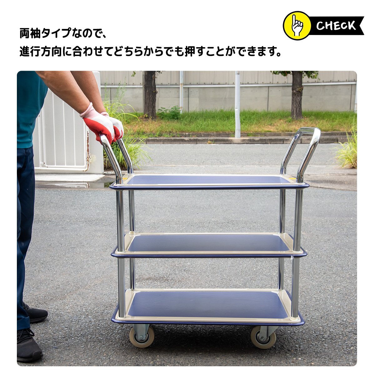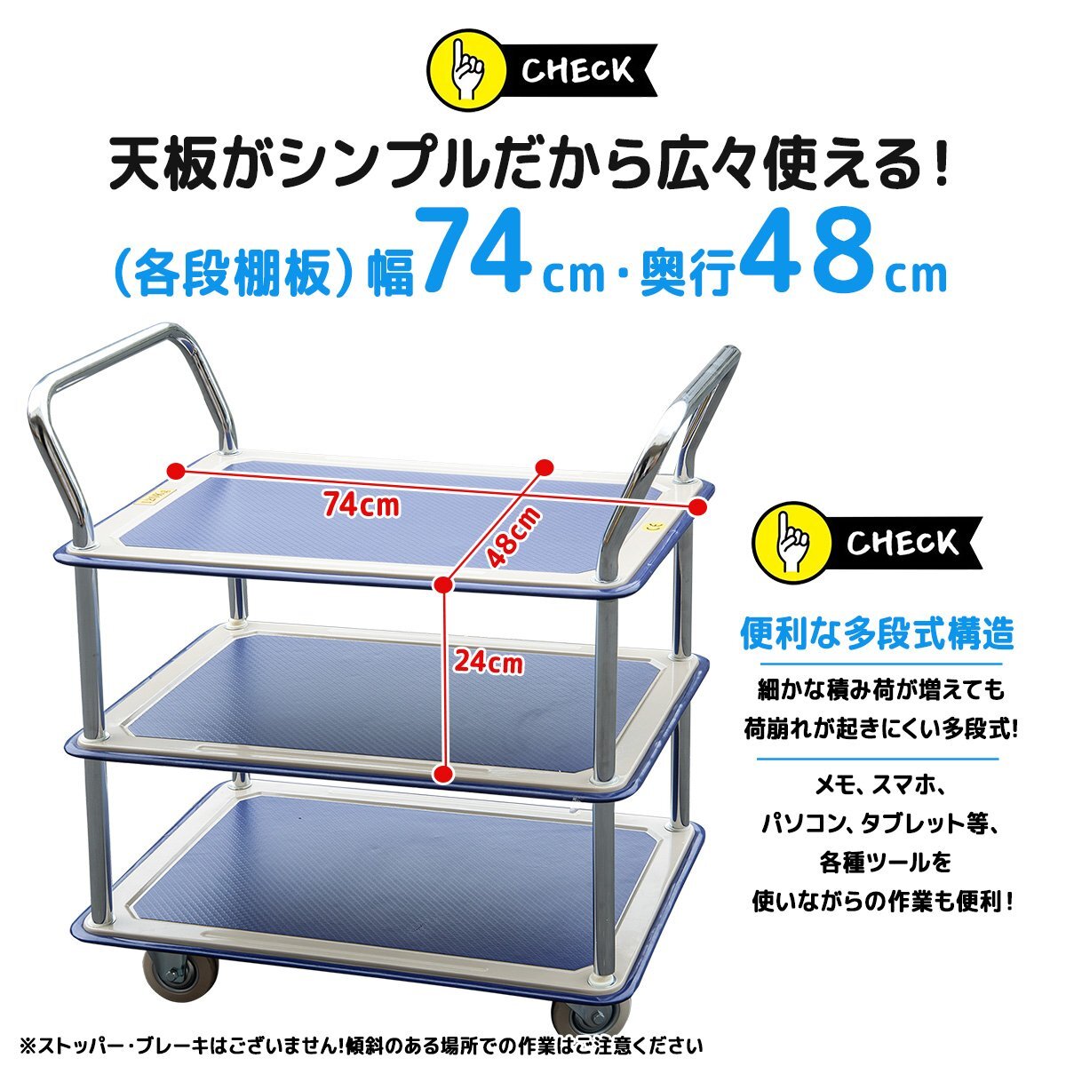 3段棚タイプで荷崩れが起きにくく、細かい荷物も整理しやすい設計。ノートPC、タブレット、スマホや工具などを置きながら効率よく作業が可能です。