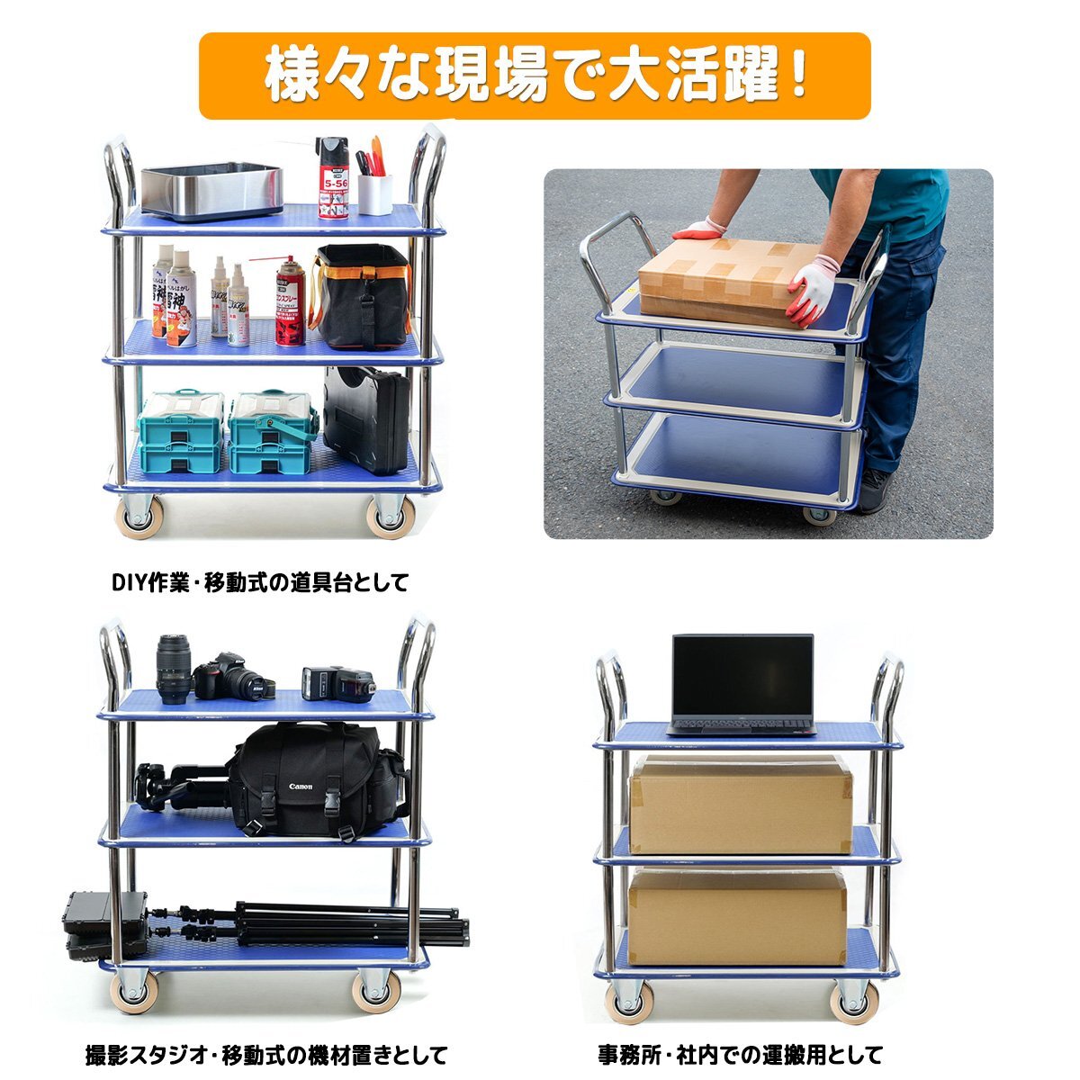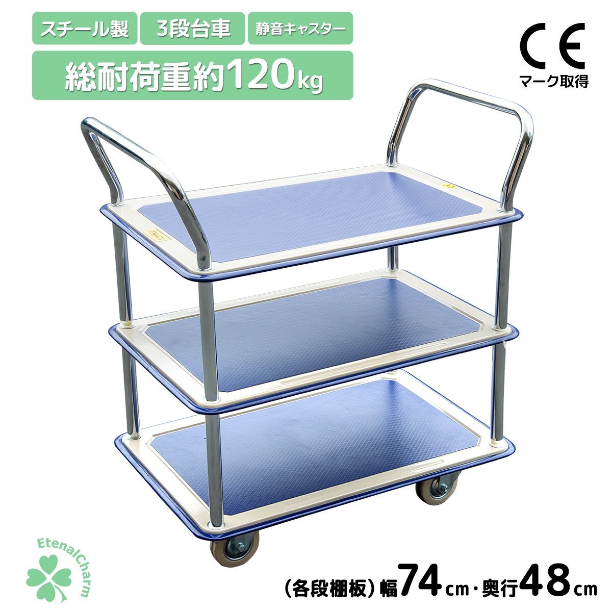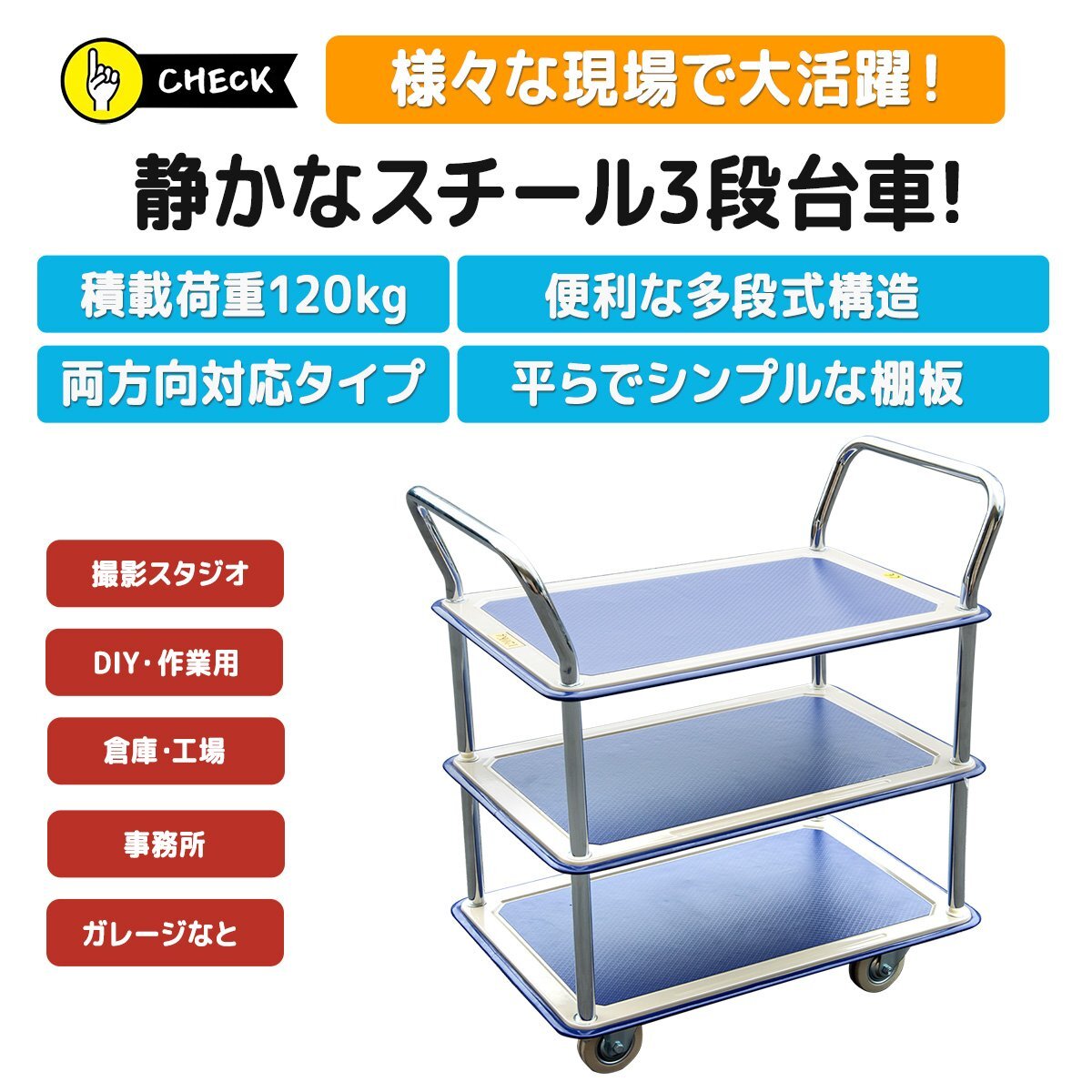 【送料無料】スチール製 3段台車 静音キャスター 耐荷重120kg 自在キャスター 多段式 ワゴン 棚付き DIY 倉庫 工場 オフィス ガレージ
