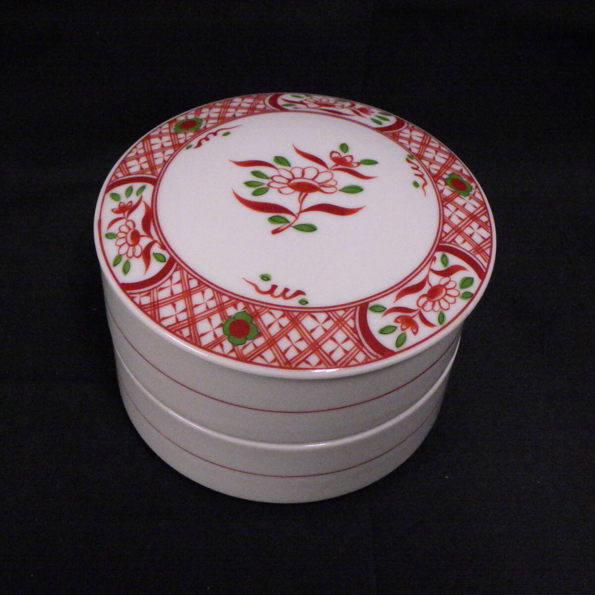 昭和 レトロ 橘吉 たち吉 赤絵 二段重 重箱 蓋付き重ね鉢 五彩 色絵 正月 おせち料理 和食器 陶器